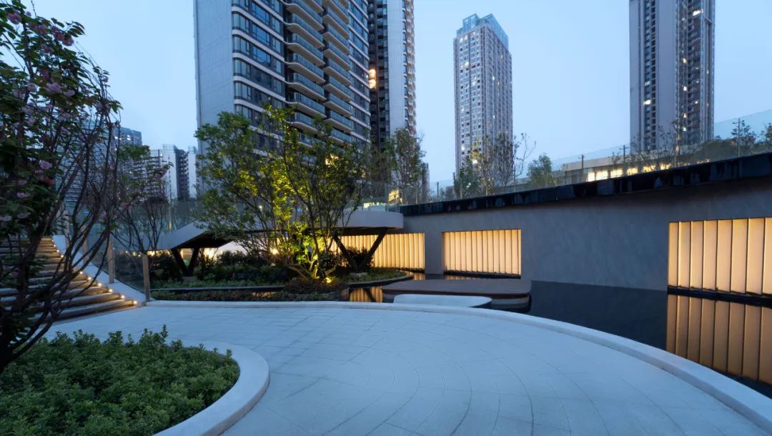 设计手法上着重于川西文化在场地中的表达,另以文化写意的方式,体现一种中西融合的精致生活态度。提取西方的现代简练与中式的山水意境相互碰撞、延展,在园中每一个角落诉说文化交织的精彩。