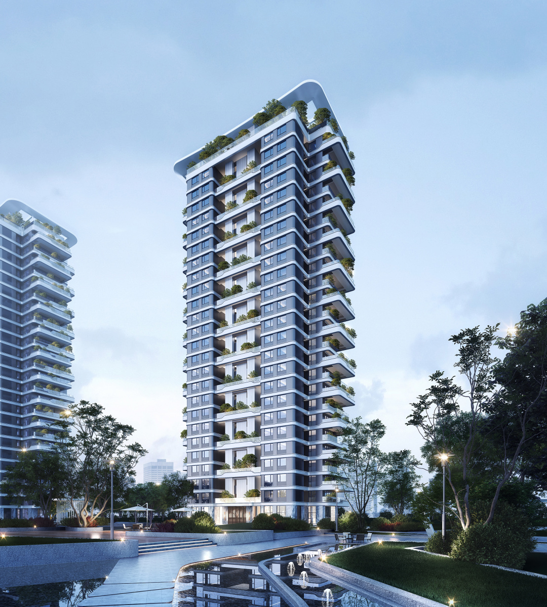 立面采用国际主义风格,与周边CBD建筑风貌相融合,顺应时代审美体验,灰+白色的建筑底图与空中绿化系统交相辉映,体现“第四代住宅”特有气质。建筑被绿化包裹,曲面转角阳台的设计,打破了建筑的边缘。错落布置的空中花园,使立面造型颇具新意,彰显出国际化现代生活格调。