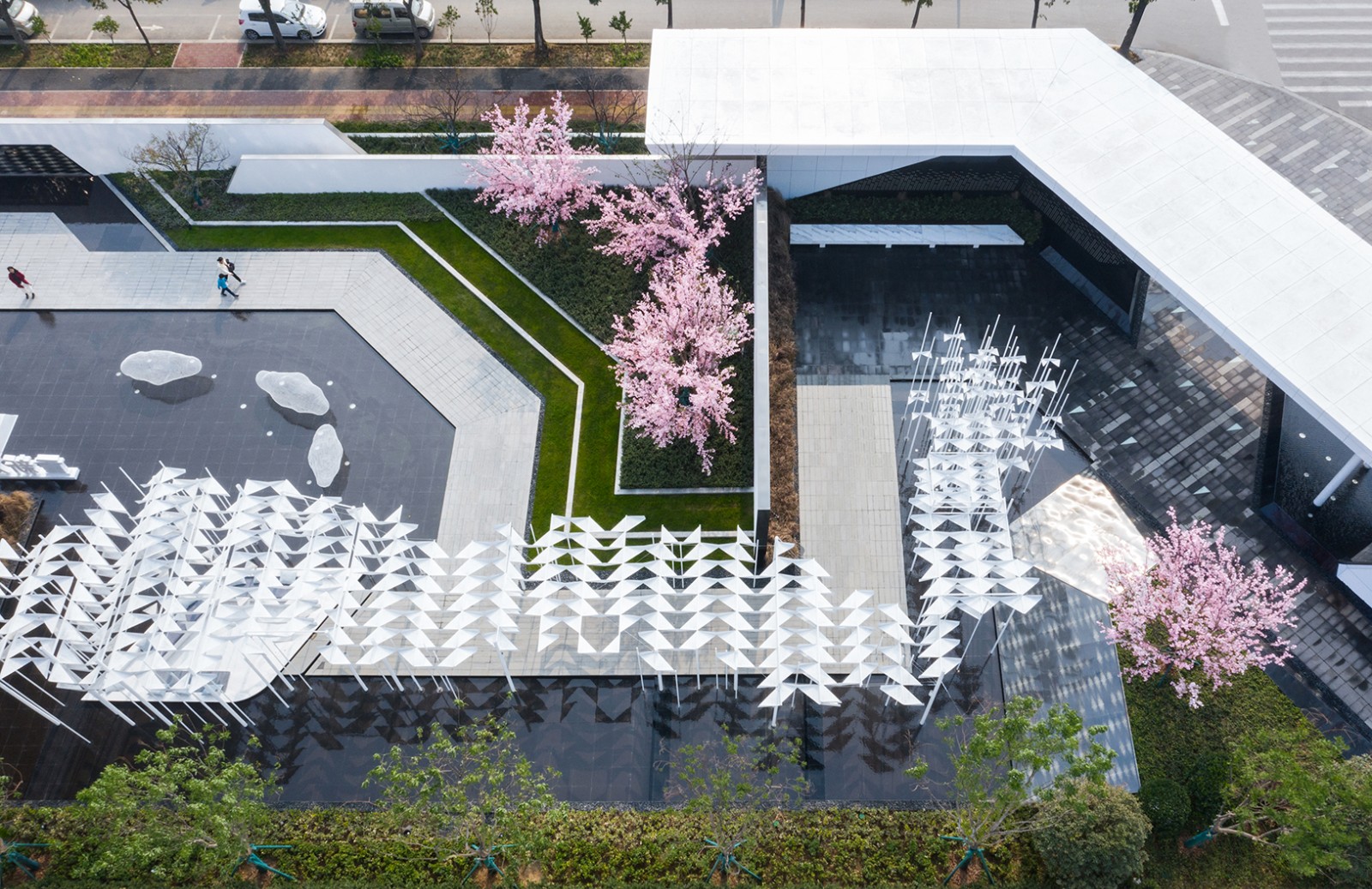 为了使示范区呈现整体统一的形态,设计手法上从传统千纸鹤的折纸形式入手,将白鹤的形态进行几何重构,从中提取菱形作为设计基本要素。通过三维翻转搭建立体感强烈的空间体块,细节采用渐变打孔来彰显细节的阴影变化,以及打破沉闷的界面,体现轻盈的悬浮感。