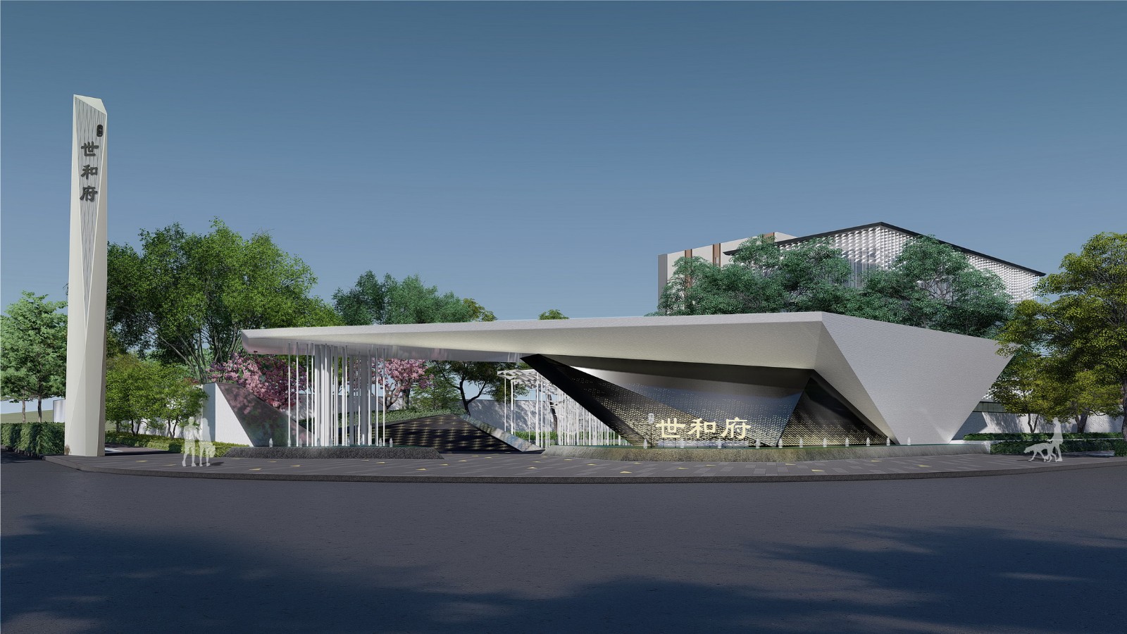 几何感强烈的门楼形象在路口焦点将人们的目光与脚步吸引,高逸与质感成为示范区的第一重映像。轻质的白色顶部造型横向延展,黑色的镜面不锈钢与路口行人产生镜像互动,近水面钢板做悬浮感渐变穿孔处理,平行世界的旅途由此进入。