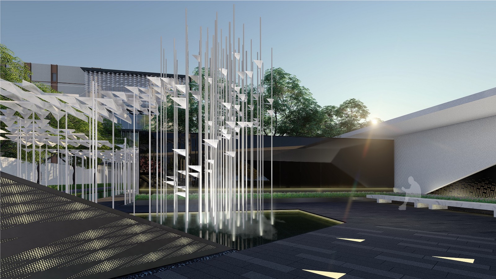 但后期为保证示范区的品质感,最终还是将开放的城市互动广场转变为一个围合型的艺术空间。打造随着白鹤的五种动态“鸣、飞、舞、憩、嬉”穿行体验的浸入式空间,让进入其间的游人近距离地与鹤共舞,体验到高雅轻盈的艺术氛围。虽少了几分喧嚣与欢笑,但多了几分安静与空灵。