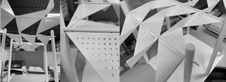 鹤舞廊架最初设计时只考虑作为一个光影廊架的形式出现,后来经过设计推敲,逐渐演变成了偏向体验式的艺术装置形态。为了体现折纸形态的一体化表现,打造鹤群向上飞舞的视觉效果,设计师对单片穿孔大小与渐变规律进行多次试验,并反复推敲廊架间衔接方式、支撑结构类型与形式之间的关系,使之最终得以实现。