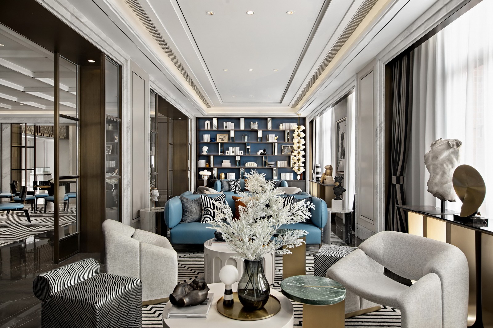 软装表现上以钢琴漆,大理石系列深的家私基础为主,配以棉麻,皮艺,局部搭配艺术的饰品,营造出一个色彩和饰品层次丰富的空间。