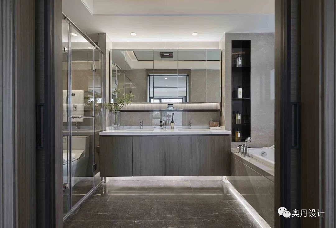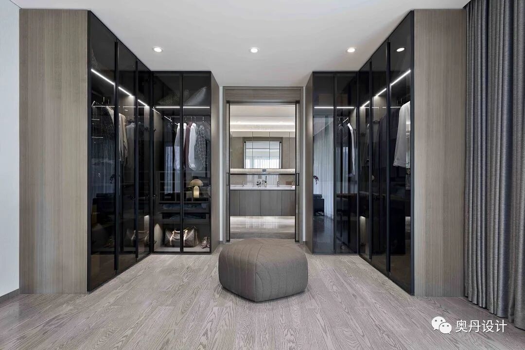 卧室衣帽间一体化也增加了卧室的整体面积,金属及玻璃门提升品质感。步入式衣帽间功能强大,连通卫浴一体,空间感及体验感都得到最大程度的体现。