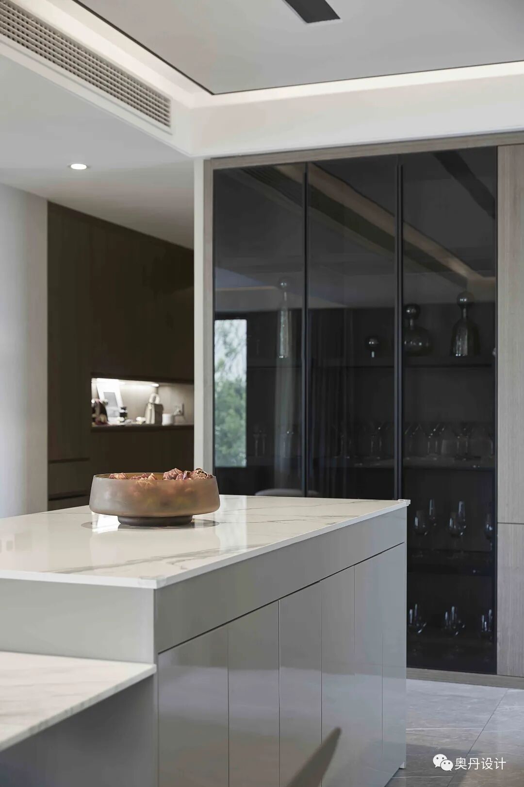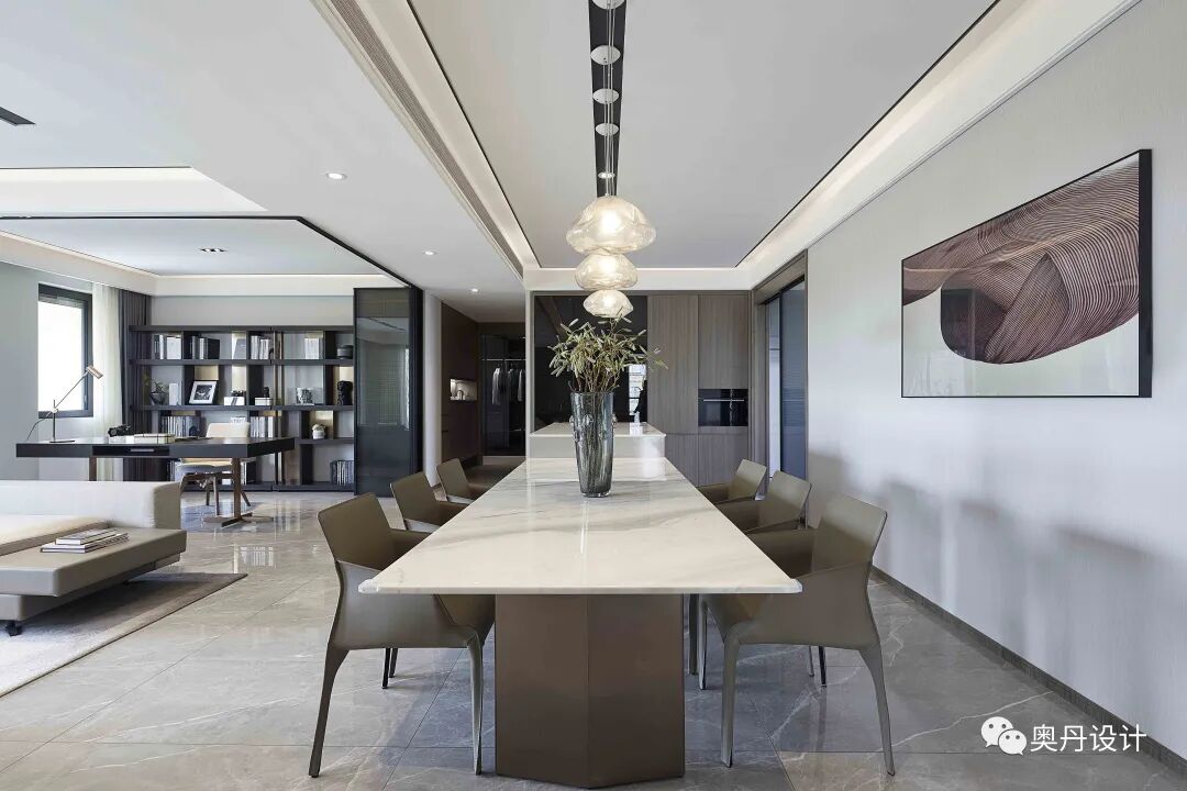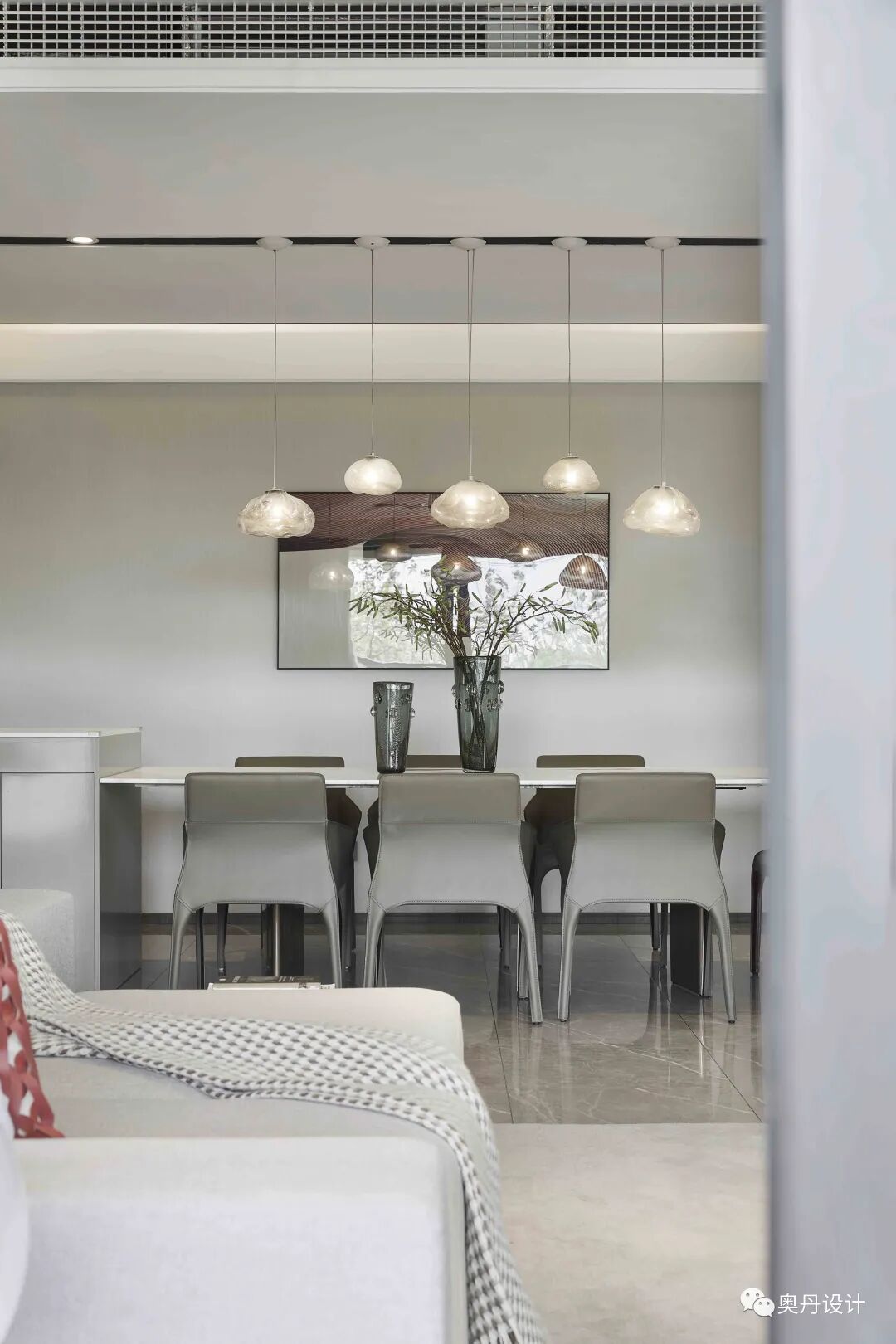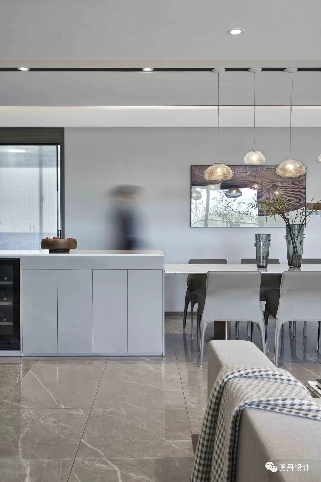 餐厅功能的多样性,体现在它既可以是一个备餐台、烹饪操作平台、美味体验台。功能上的一体化带来更多的便利,方便主人在款待亲友及客人的同时,谈笑风声,体验互动参与的乐趣。设计师赋予了它更多的意义,使它成为承载家人亲情的情感纽带,也是和朋友之间很好的情感交流场所。从厨房到客厅再到餐厅的过渡,即是独立又是一种衍生和关联,高级灰柜体和白色的大理石餐桌台面相得益彰,功能柜一体化,美观实用设计合理,云朵般的艺术灯饰,营造出了温馨浪漫的就餐空间氛围。