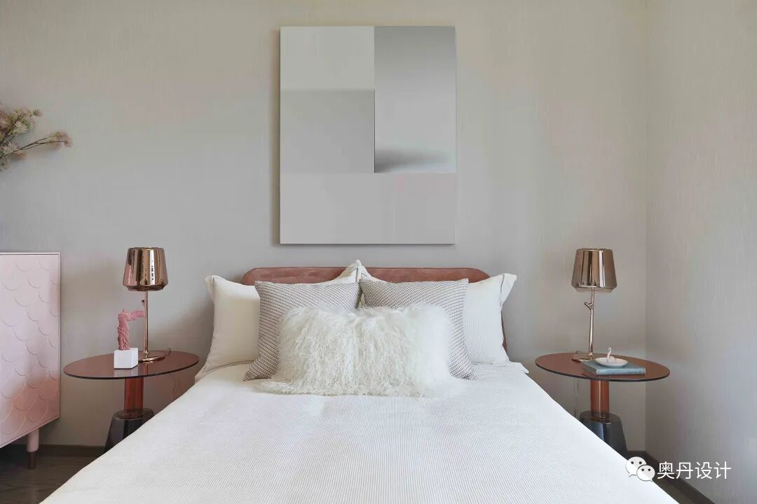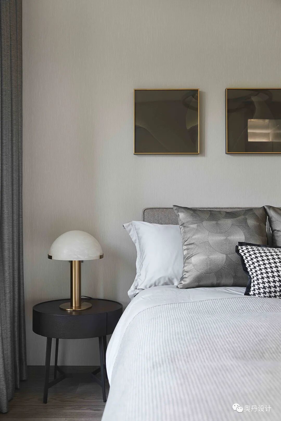 老人房相较之其他空间更简洁明朗、古朴大气。拉丝金属装饰画点缀着它的简约古朴,轻奢低调,极简线条的家具装饰以及玉石透光台灯,多元化的材质与线条的交融,打破传统乏味难以突破的老人房空间格调,软硬装上细致淋漓的体现着空间品质感。
