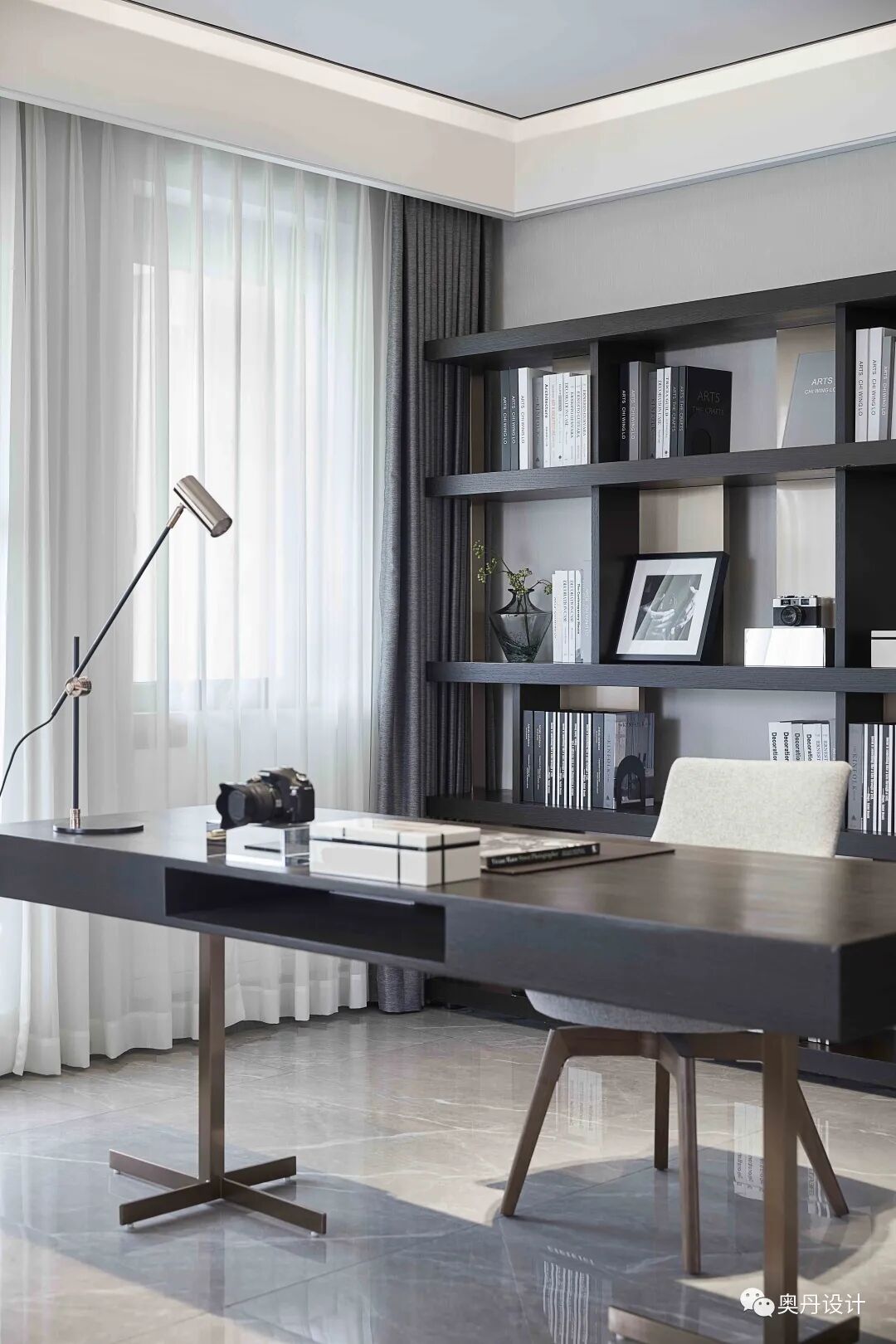 书房整体空间展现依然遵循了简奢的设计原则,与客厅的设计风格达成了和谐和统一,整体以黑色作为基调,混合着金属质感极强的香槟金和大理石地面,极大的丰富了书房的层次感,使得整个空间在高级的同时也不会显得单调。收纳能力十足的书架展示,是主人雅致收纳及艺术品展示的地方,很好的点缀和丰富了大空间的装置艺术。客厅与书房间增设了一道可移动的玻璃移门隔断,兼顾审美和功能性两种需求,在办公的时候可以打开,能很好的保证书房的私密性,在不需要的时候可以将玻璃移门打开,空间顿时又开阔起来。这样的设计就很好的实现了人性化与设计感的价值统一。