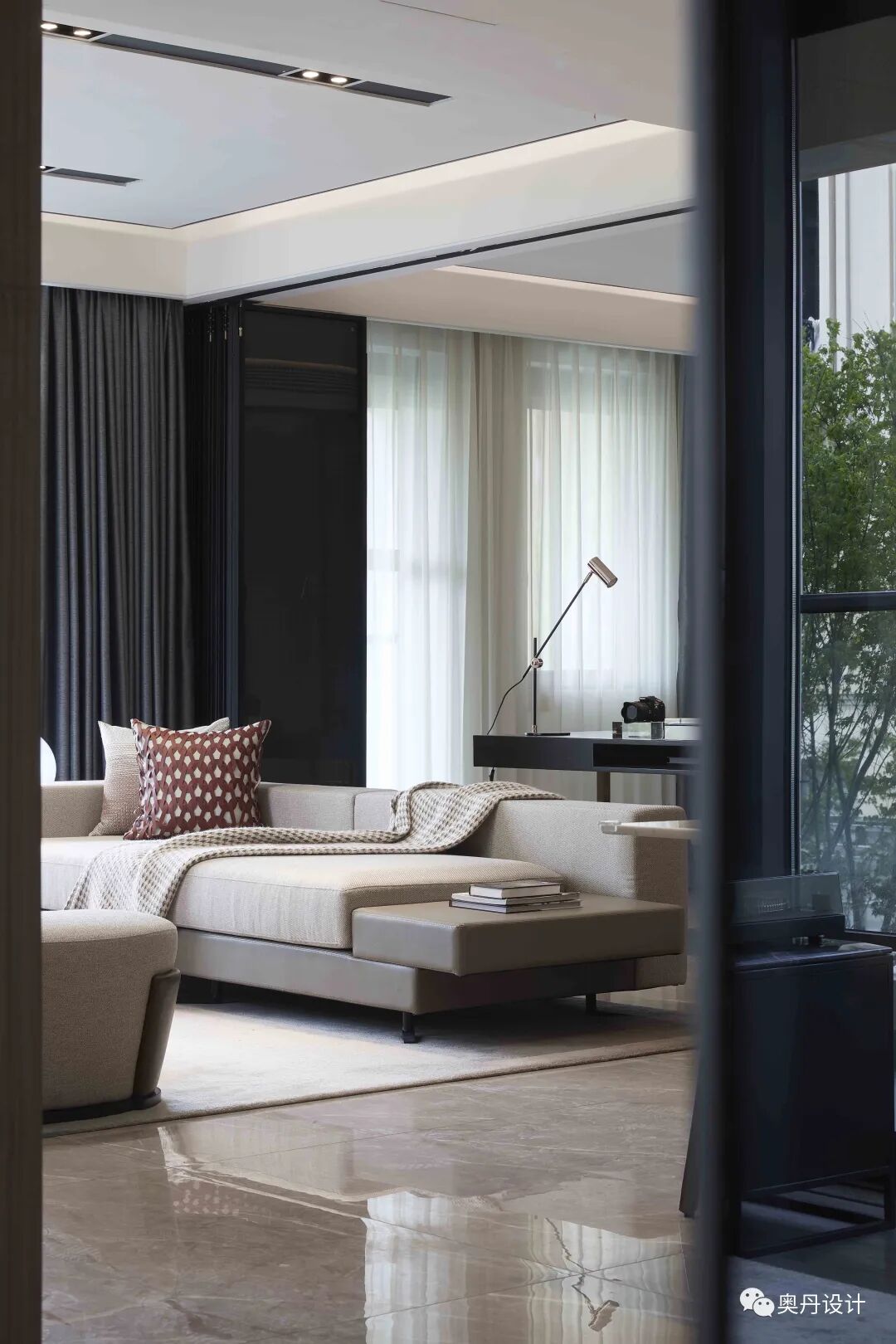 本案客厅整体的设计风格简约而不简单,带着淡淡的轻奢气息。摈弃了传统的“电视中心式”的布局,从而留出了更大的互动空间,互通的环境也十分方便居主读书办公及陪伴家人,使公共区域能够最大化的发挥它的作用。整体风格沉着稳重,简约大气,典雅华丽但并不浮夸,低调透漏出奢华,高级感十足。敞亮的落地窗阳台,很好的将室外风景和阳光揽入室内,摈弃了传统的吊灯装饰,使空间显得更加简洁干净,提升了客厅的品质感和一体感。大空间层次分明,区域分工合理,互通却又相互不打扰,立体的空间展示平行的生活方式,每一处都充满设计情感及家庭温馨。