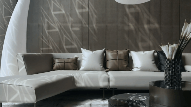 地面灰色石材铺垫的空间情绪,加之落地窗上的钻石纹路,让光线如水波流动,艺术感充盈而丰沛。沙发后以山石灯饰造景,疏影斑驳摇曳,将空间之灵动演绎到极致。