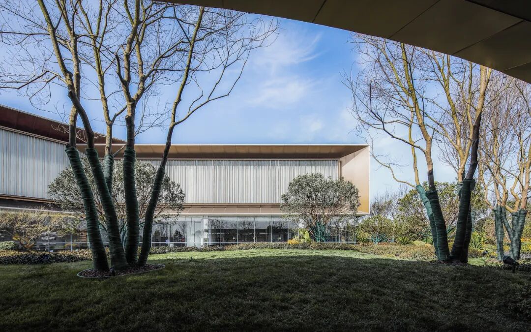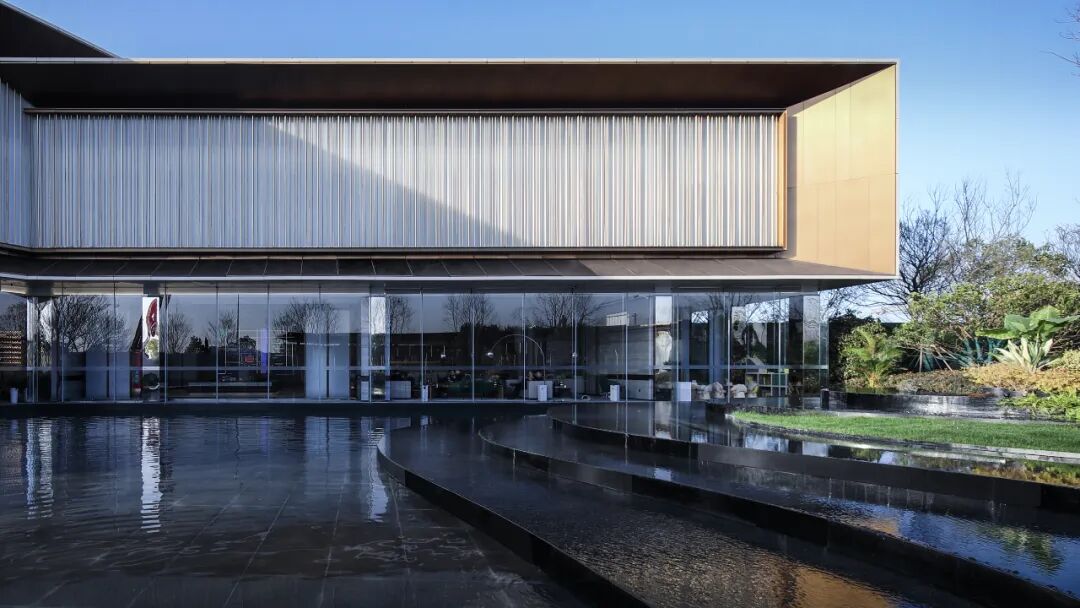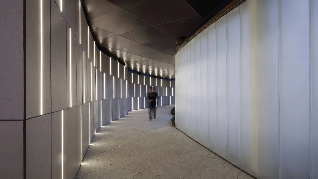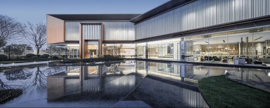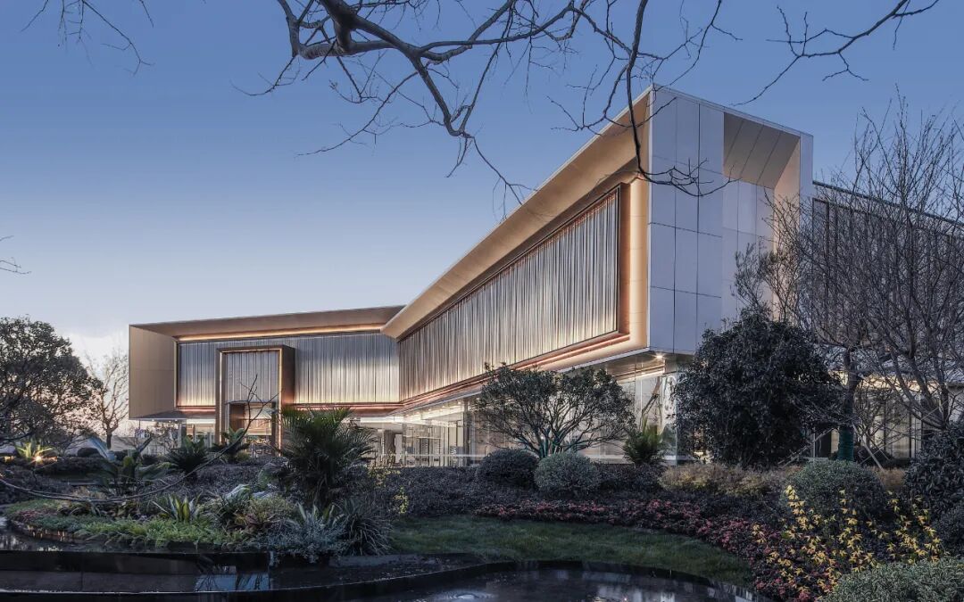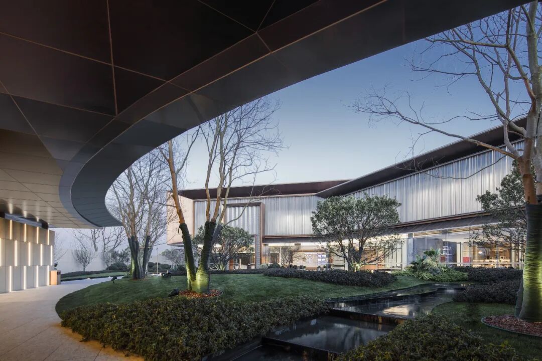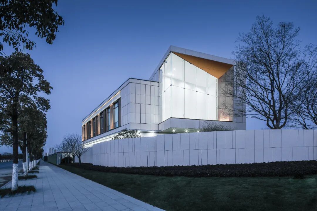 简洁平整的体块组合舒展有序,形成虚实对比强烈的立体效果。通过建筑整体的形态、肌理、光与彩、细部构造等,打造整体化全息空间体验。几何造型的排列组合与玻璃幕墙的结合,将建筑与景观泛光效果为一体,通过简洁清晰的外形,向人传递明确且直观的信息,在夜晚显得格外通透干净。