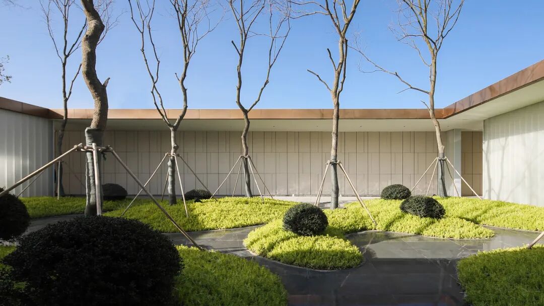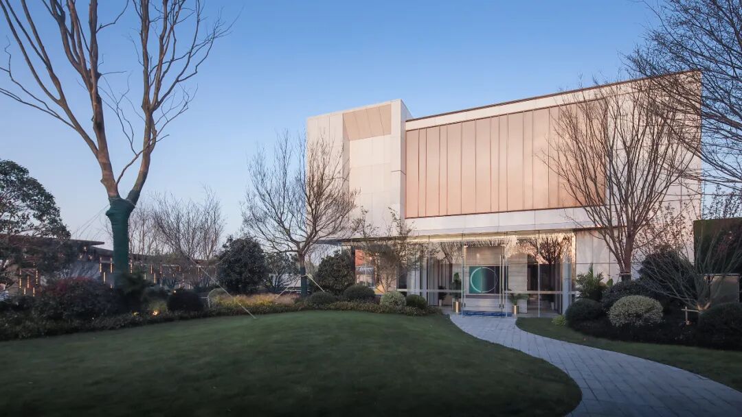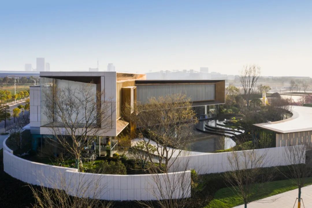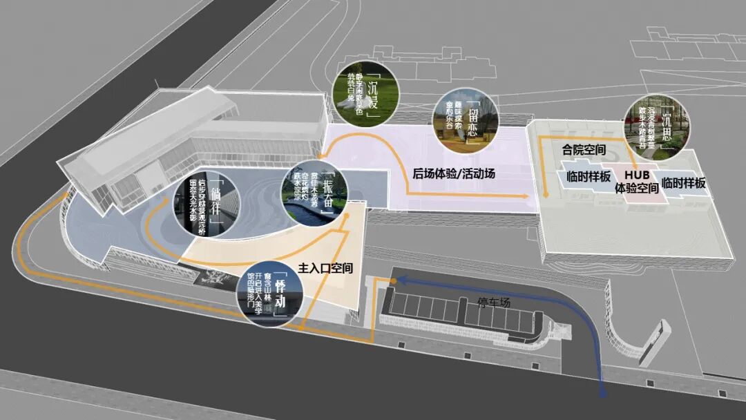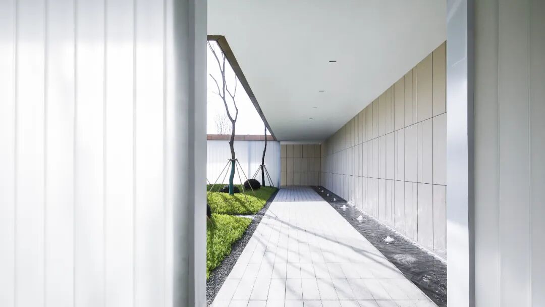 通过连廊围合出中庭空间,以动线首先穿过连廊,进入生活展示馆,再穿过一段廊架进入HUB空间,半围合式的布局在保持整体一体化的同时,也围合出多层次的隐密之所。换鞋&等待,可进入两边的样板间。