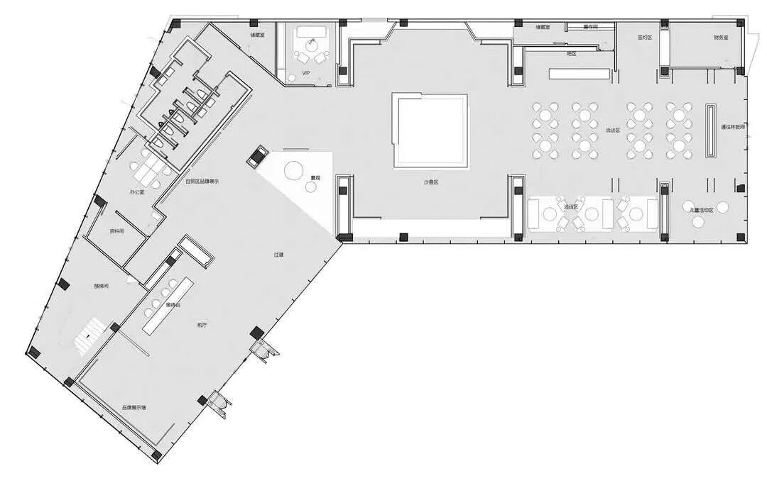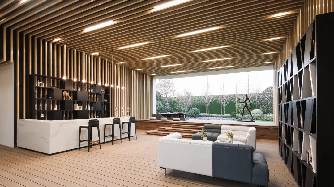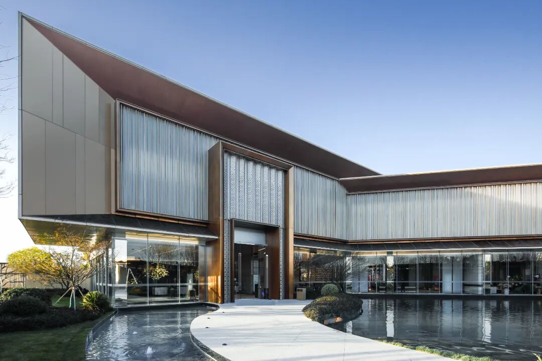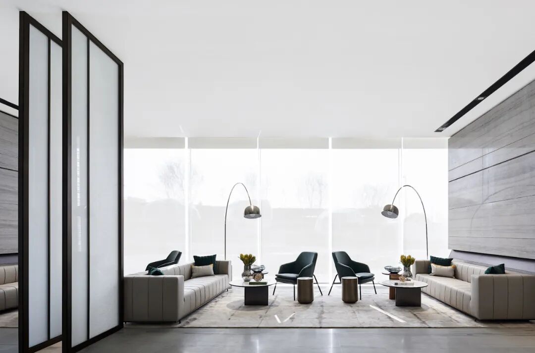 通过连廊围合出中庭空间,以动线首先穿过连廊,进入生活展示馆,再穿过一段廊架进入HUB空间,半围合式的布局在保持整体一体化的同时,也围合出多层次的隐密之所。换鞋&等待,可进入两边的样板间。