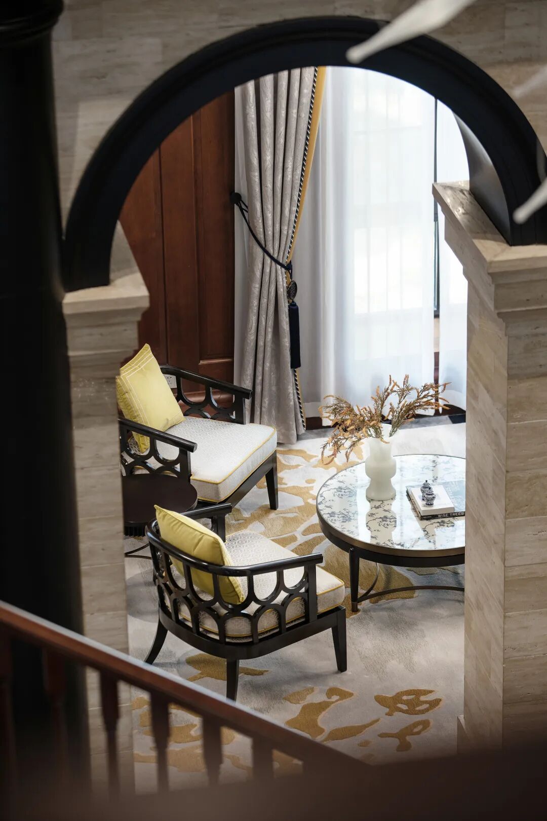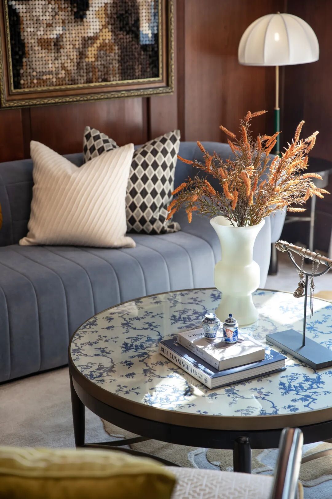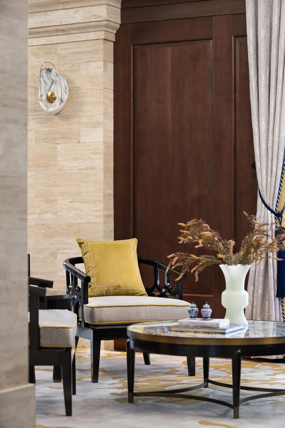 桌面细腻的提花纹样诉说着古老传统的往事,而简约造型的丝绒沙发标志着现代生活的高光时刻。