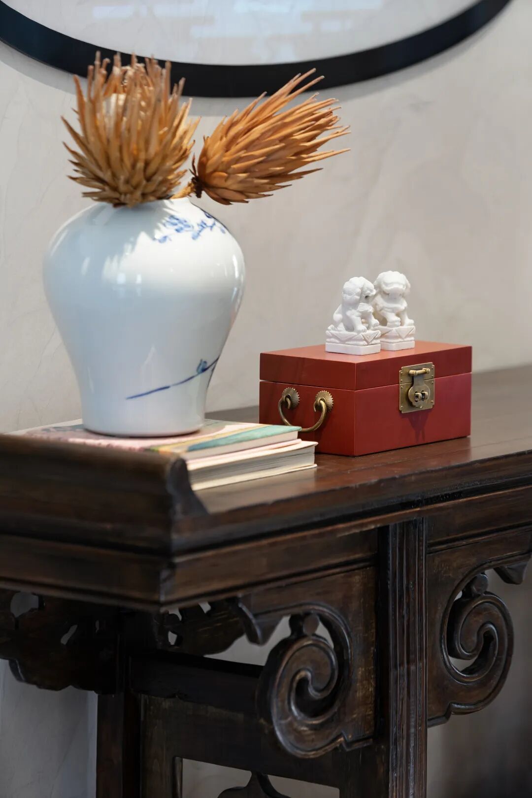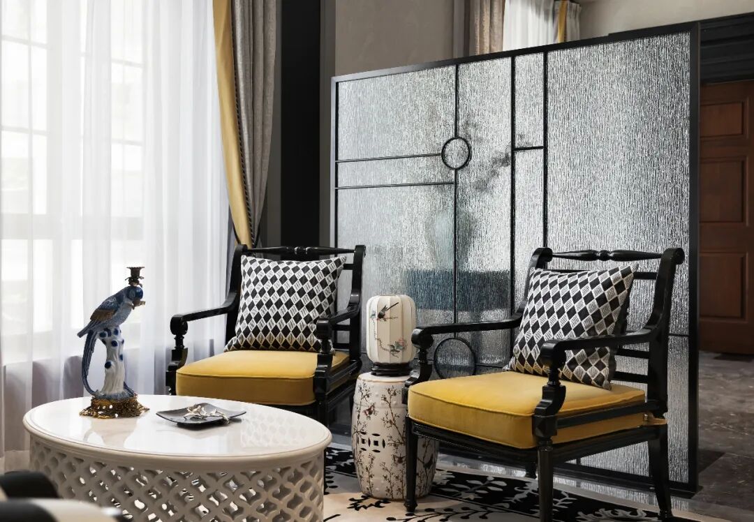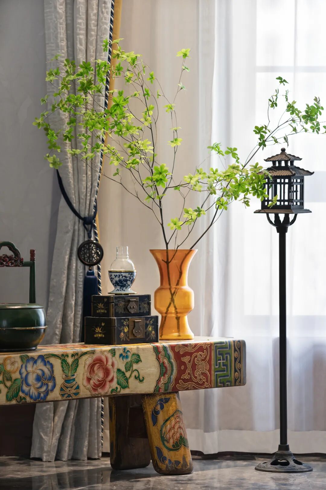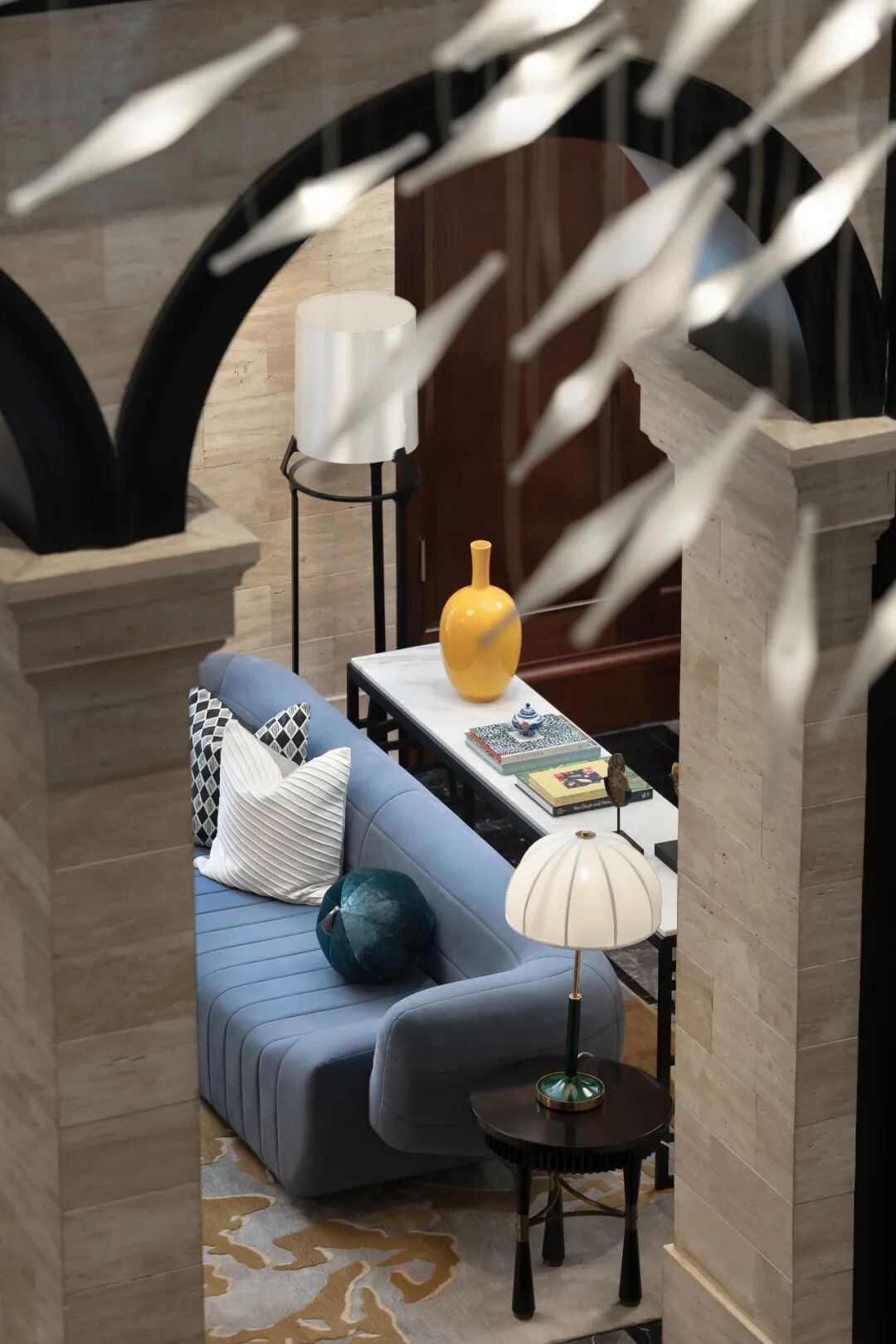 桌面细腻的提花纹样诉说着古老传统的往事,而简约造型的丝绒沙发标志着现代生活的高光时刻。