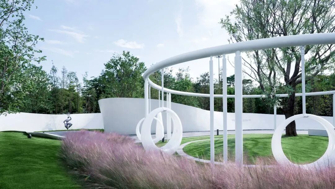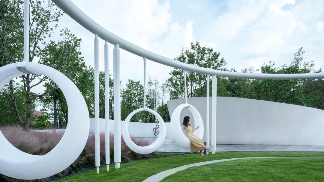 曲径尽头的环形秋千既是引廊隧道的结语,又是活力诞生的引言,在设计上将能使人即兴参与和互动的秋千融入其中,以景观的语言重绘生活中的宁静和欢笑。