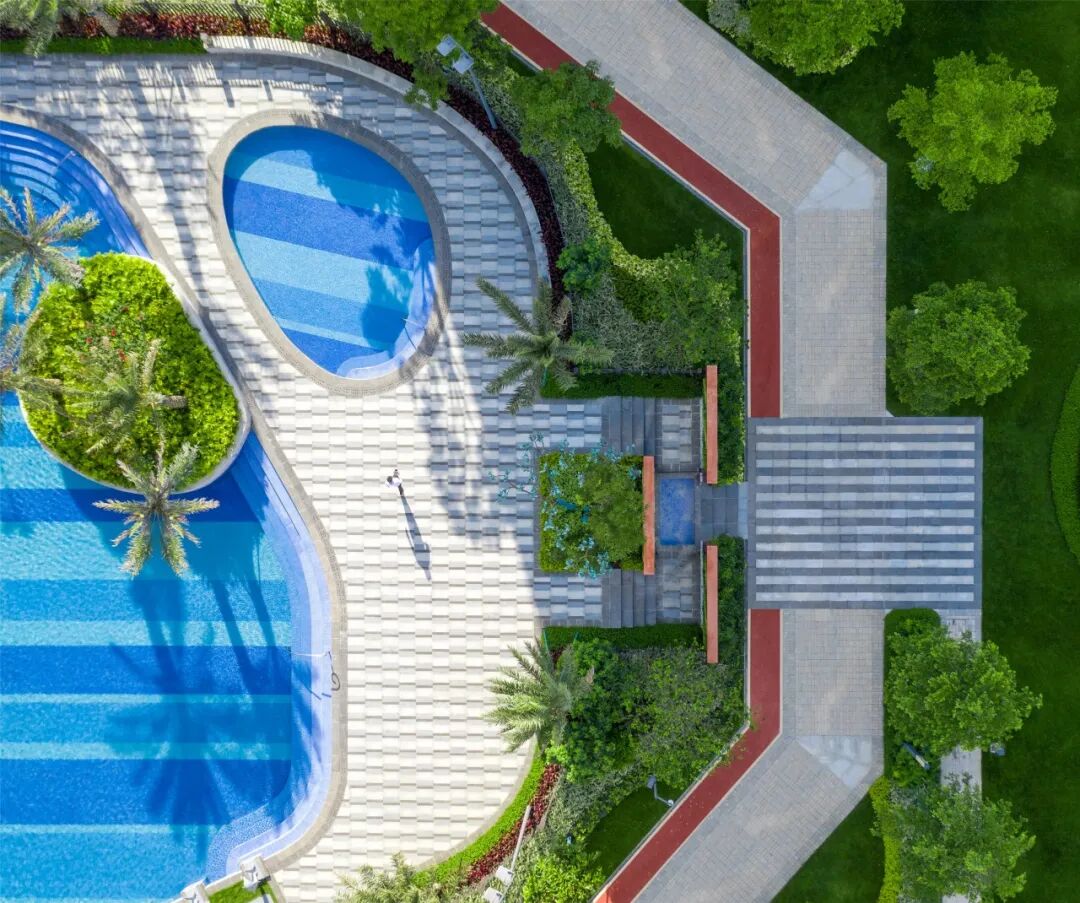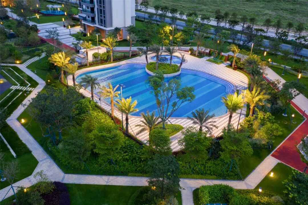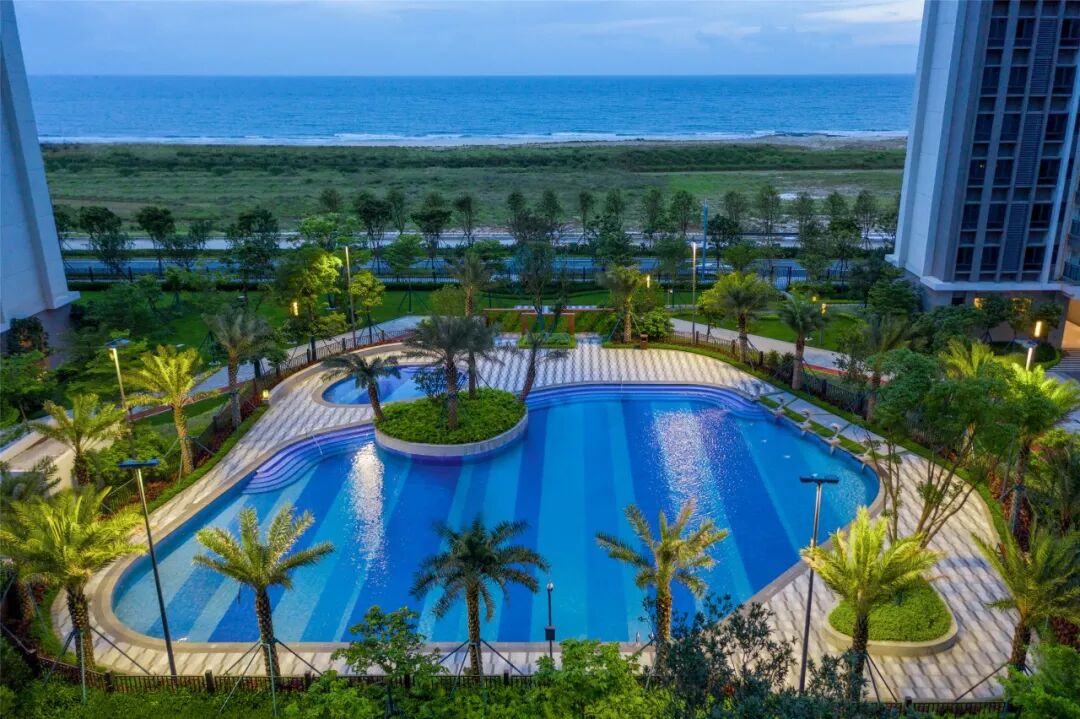 湛蓝通透的池水犹如汪洋入怀,周边精心搭配极具东南亚风情的椰树与海洋雕塑小品,水景与美景交融,畅游其间,仿佛置身无边界大海。