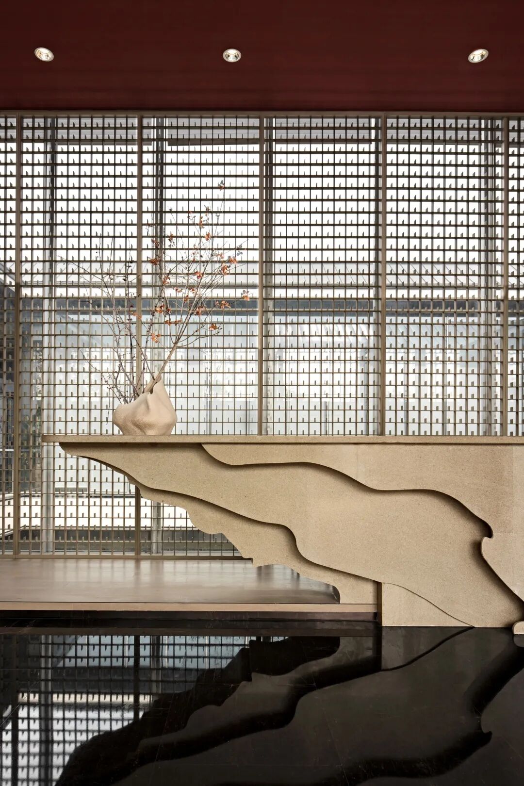 设计谨慎而克制的选择材料,U玻、格栅、景墙、水池虚实结合,借助质感和肌理的变化,呈现空间纯粹而自然的感觉,动静相宜,灵秀生动。