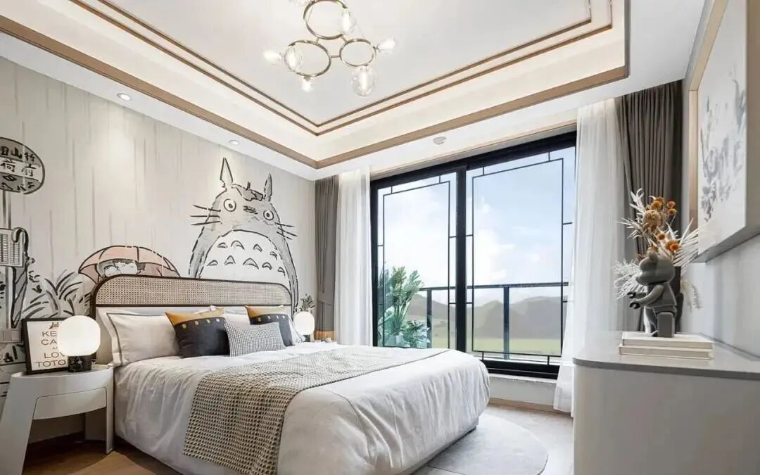 步入客厅,一整面千里江山图,与餐厅空间中水墨意向的小幅挂画,相互映衬;餐客一体化空间,整体轩朗明亮,匹配世家气度;南面老人房,与前庭花园相互呼应,配上大面积落地玻璃,为长辈创造舒适且宜居的居住环境。