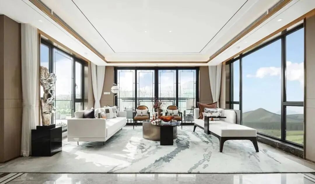 室内设计延续宋韵美学,结合现代化工艺,以天人合一的东方哲学为出发点,将江南文化中的水墨画、刺绣、茶道、花艺等人文元素融入空间。如建面约211㎡户型,首层270度入户庭院,或煮茶畅谈,或闲坐听雨,或沐浴阳光,都是一种不错的生活仪式。
