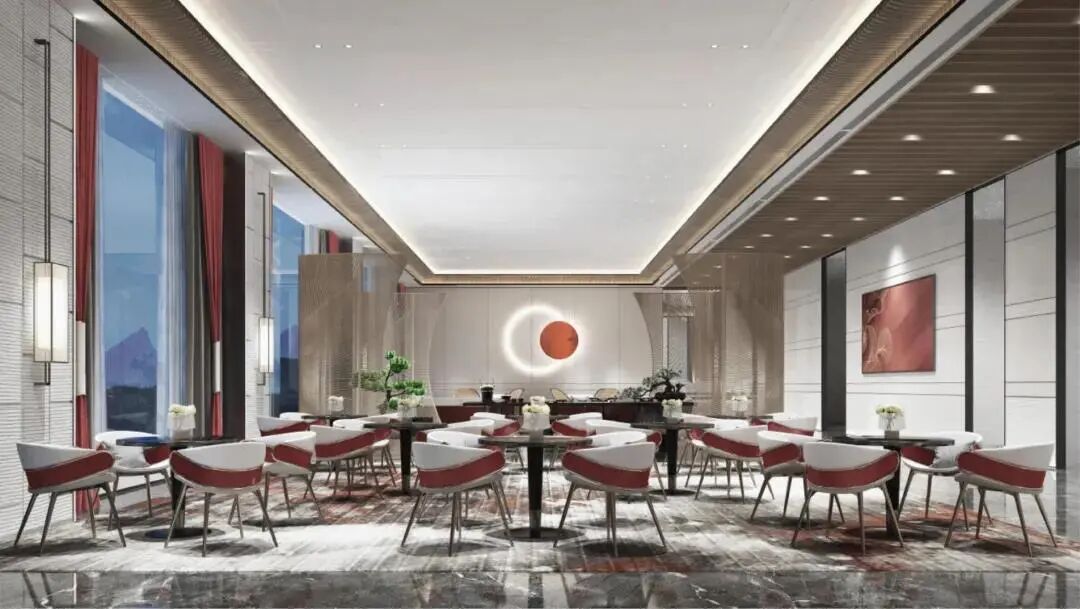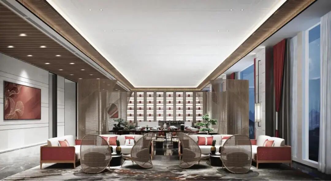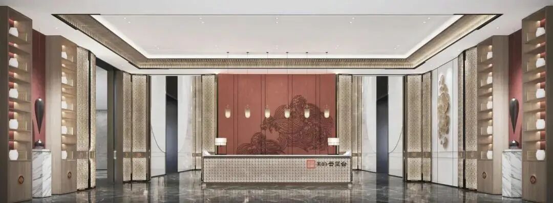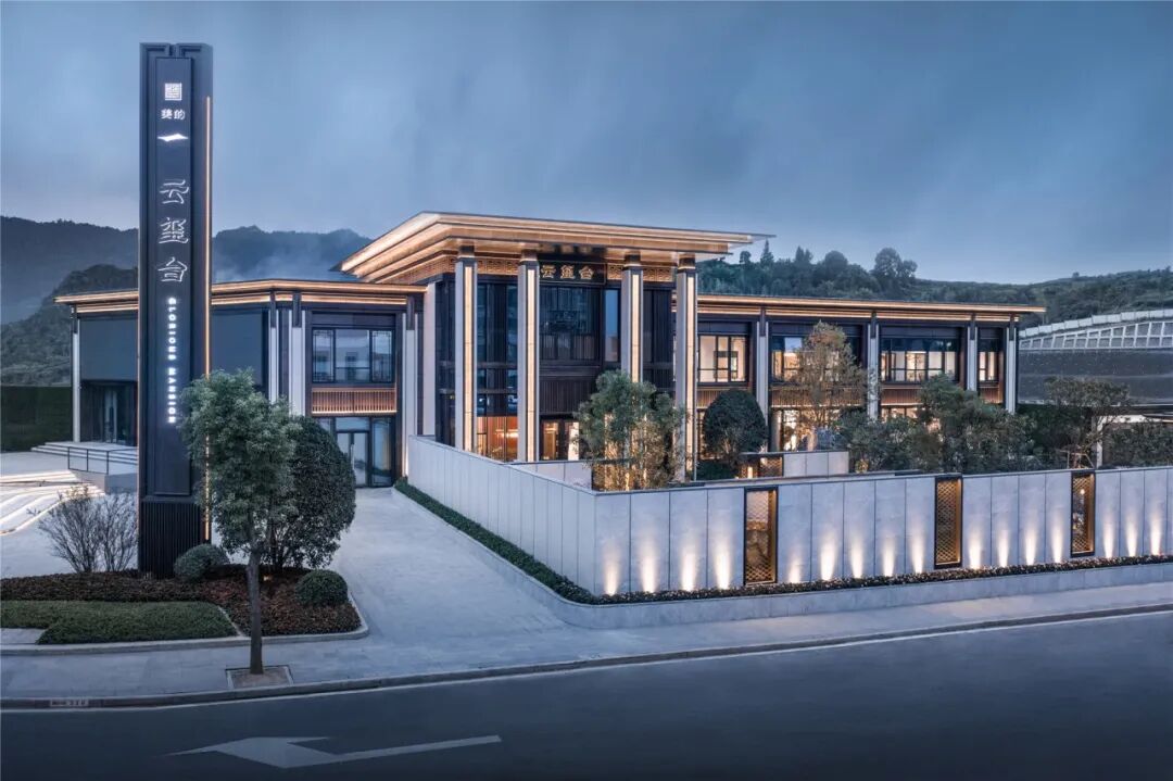 层次丰富的建筑顶部,采用传统的暖色调外墙材料,配合大挑檐、刻画形制花纹及灯光设计,既有重檐的隆重威仪,亦渲染出东方文化的诗情和韵律;简约大方的格栅设计,使内部装饰与外部院景相互渗透,尽显东方雅致之美;半隐半透的玻璃幕墙,让室外天光和室内灯光在半透明的界面处交融,塑造朦胧斑驳之感。
