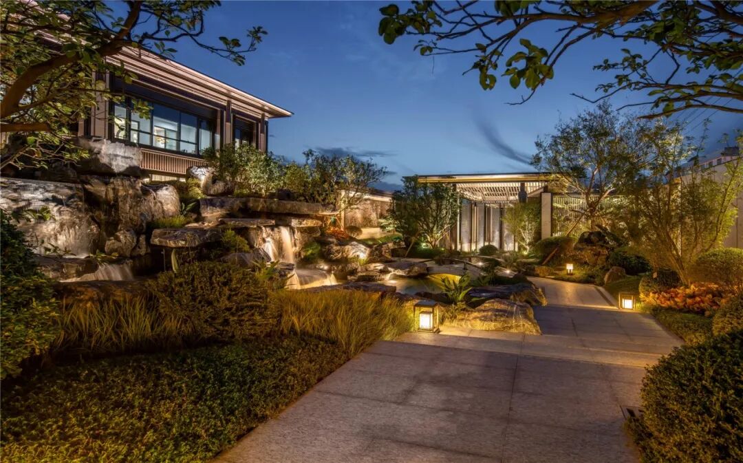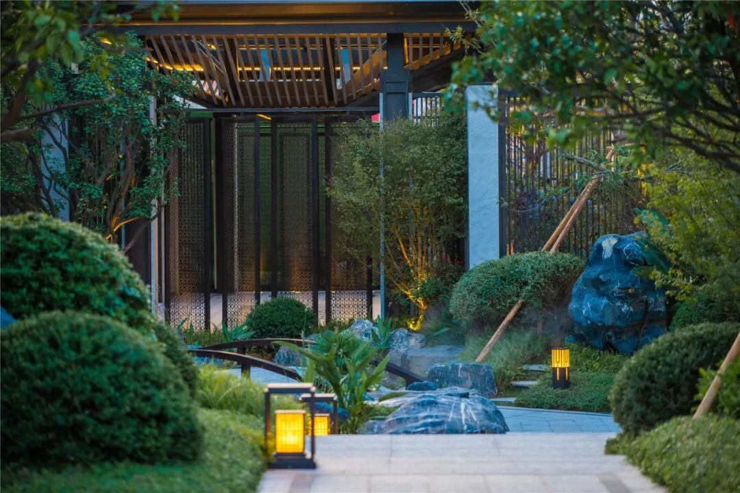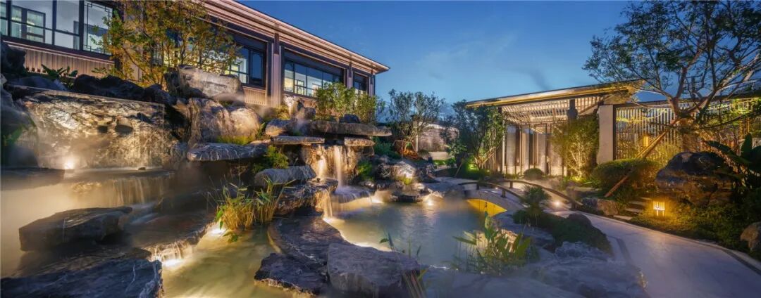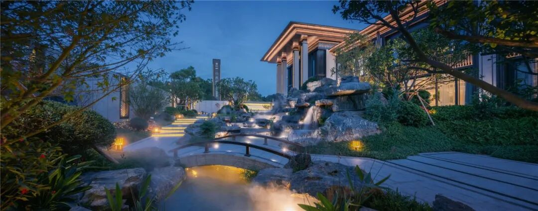 园区内曲折蜿蜒的园路连接卧波桥,伴随潺潺流水声,水上的水景和灯光装置,风过涟漪,水落溅花;内庭空间植物种植上采用生态自然的种植模式,搭配上置石叠瀑,层层水雾氤氲着,让人仿佛走进了山水之间。