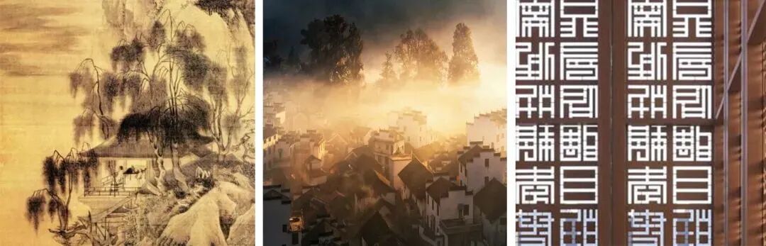 基于对场地的解读,设计利用自有高差,从《溪山行旅图》提取山、水、云、林四个自然元素,将山水的意境融入景观之中,并通过建筑的礼制精魄,聚焦“四进五景,礼序天伦”,形成丰富、多层次的景观空间结构,给人一种身临其境,畅游画卷之感。