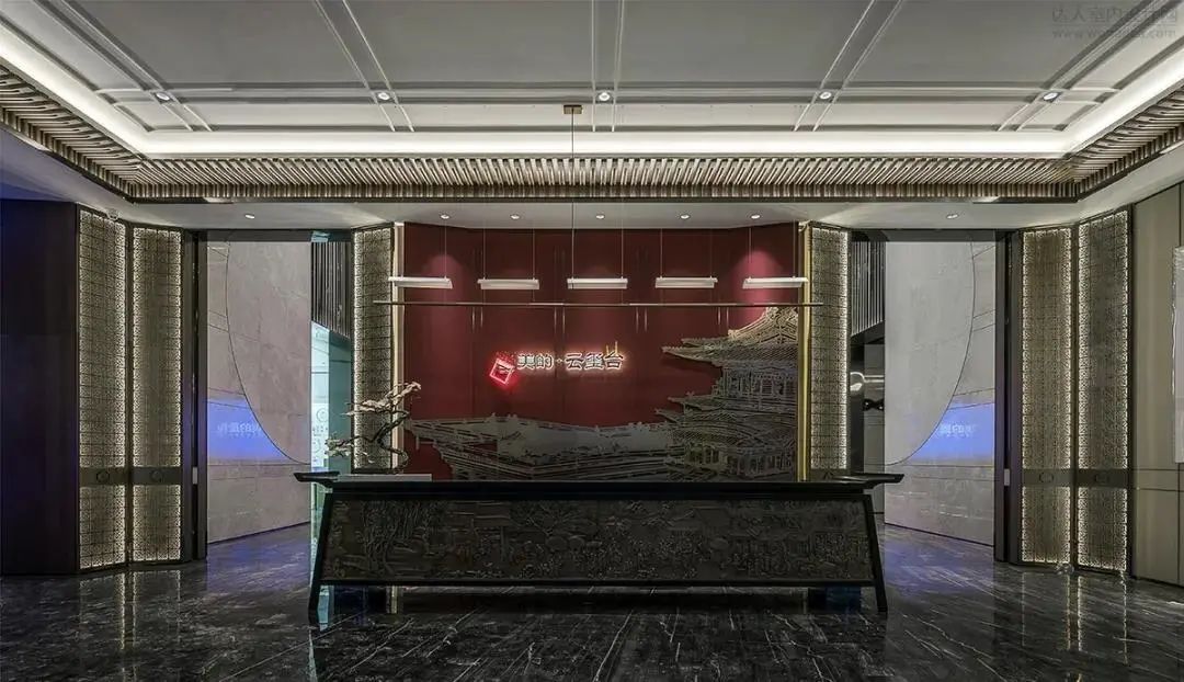 灰色石材地面低调华丽,承托了主景观沙盘,大型卯榫艺术装置《殿》,仿佛抽象水墨画,呈现出高雅的韵味和深厚的文化底蕴。洽谈区内,雅灰座椅嵌上一抹中国红,在视觉上细微调和,搭配流水意象的线条地毯,诗性生动而灵韵万千。