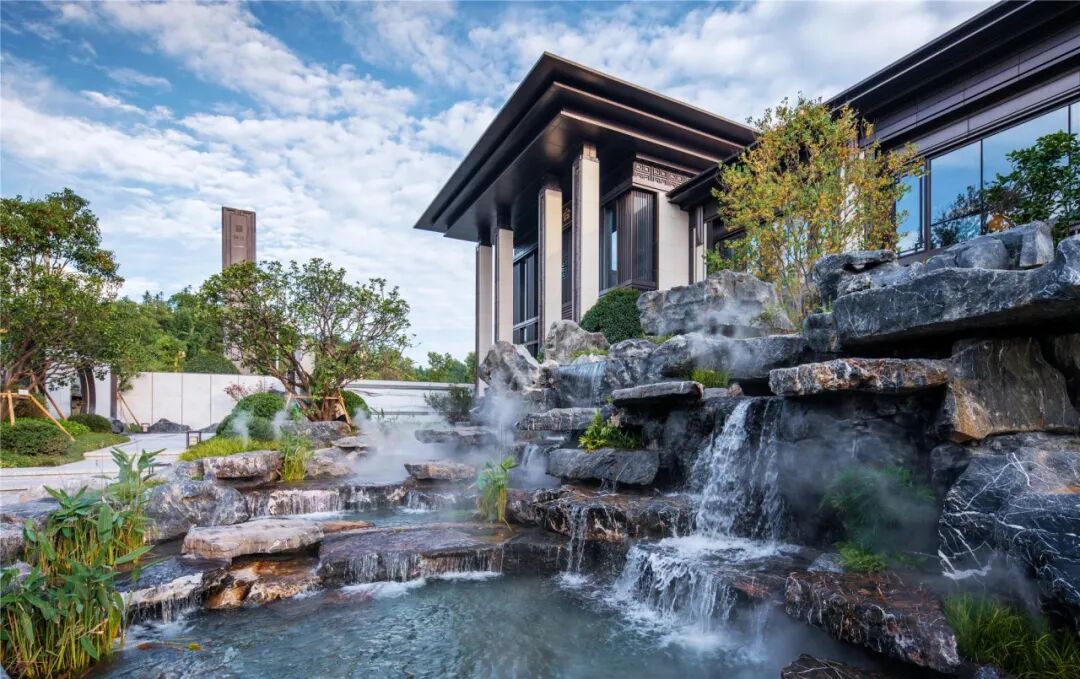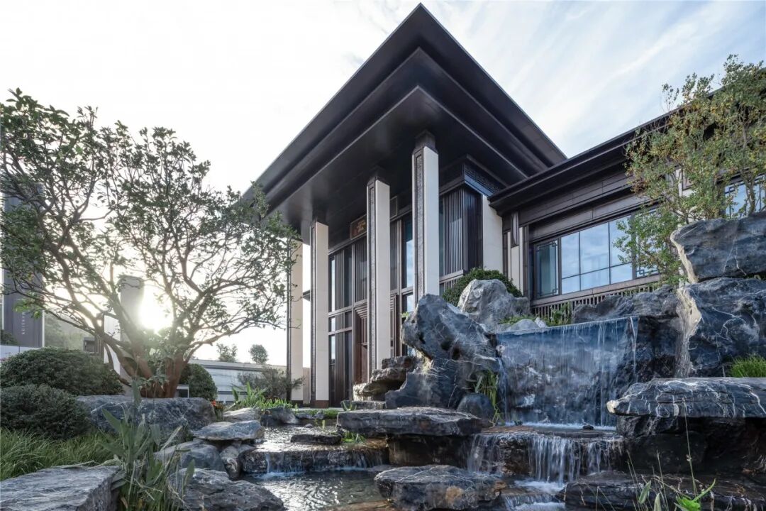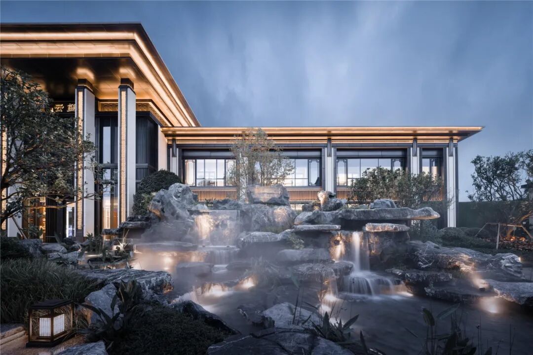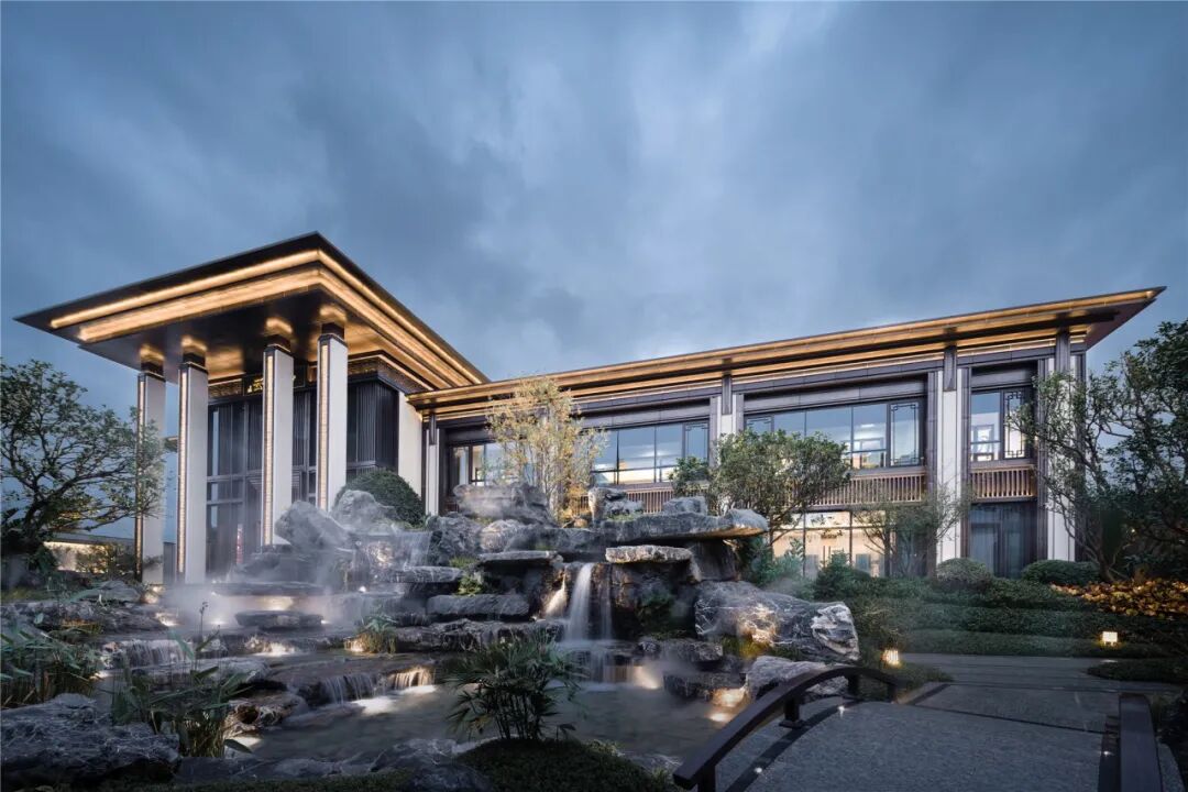 整体设计理念萃取德化自然神韵,人文轮廓,文心墨雅,浅山雅境,山水、自然和光等元素,设计尊重人、空间、自然的关系,示范区采用围合、内聚的东方意境空间布局,遵循传统礼制,以现代的手法构筑天人合一的空间场景,营造“东方雅韵”的意境人居。