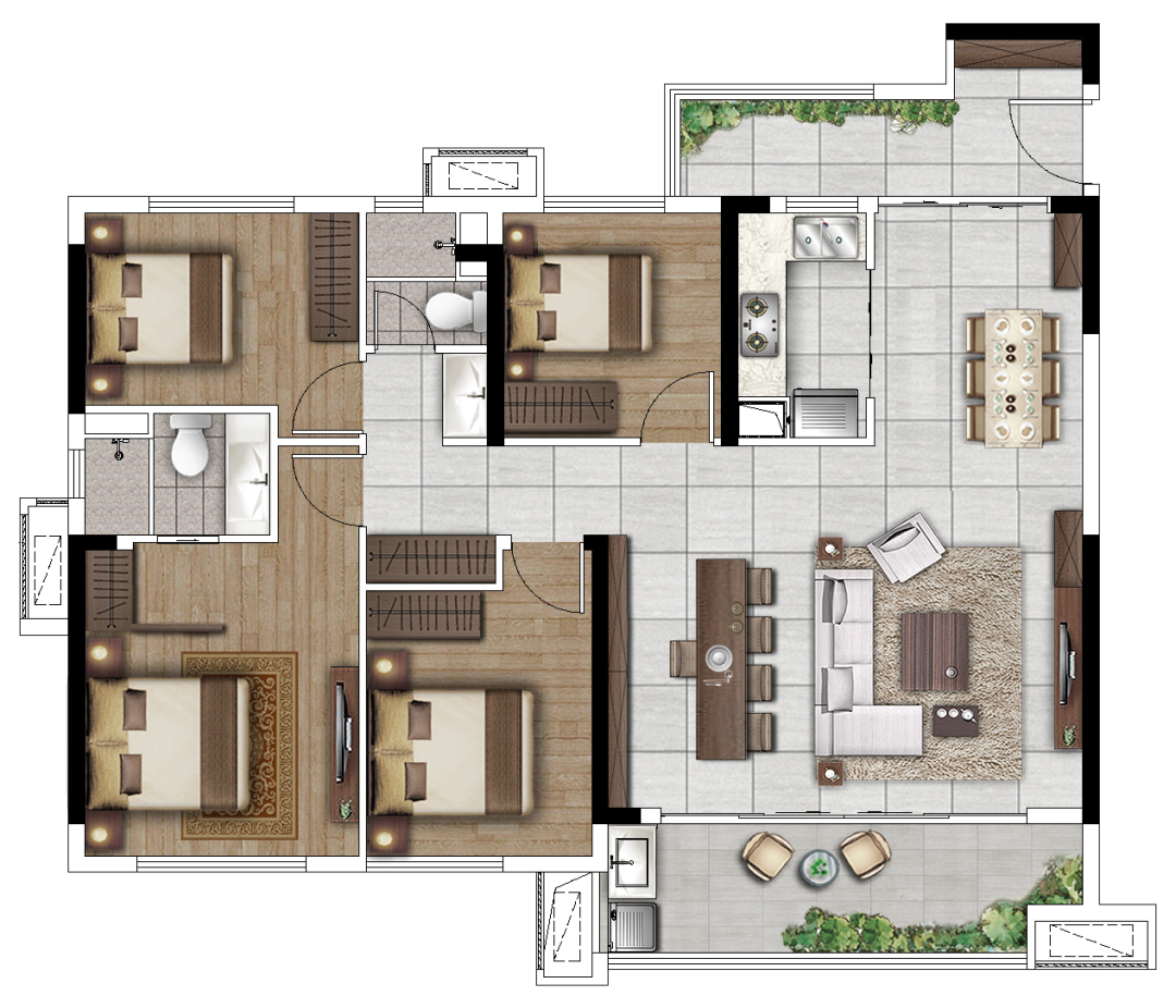 整体户型方正,布局合理。科学的生活动线划分,功能分工明确;客餐一体化设计,以大尺度酝酿生活的温度;南北双阳台,引清风阳光入室,时刻解锁生活多种“享”法;奢华四房设计,充分满足二孩家庭、三代同堂的不同居住需求。