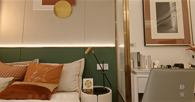 中明度和中纯度的清新橙蓝两色,与精致的软装饰品相结合,融于暖色的光环境中,静谧自然而又轻松惬意。
