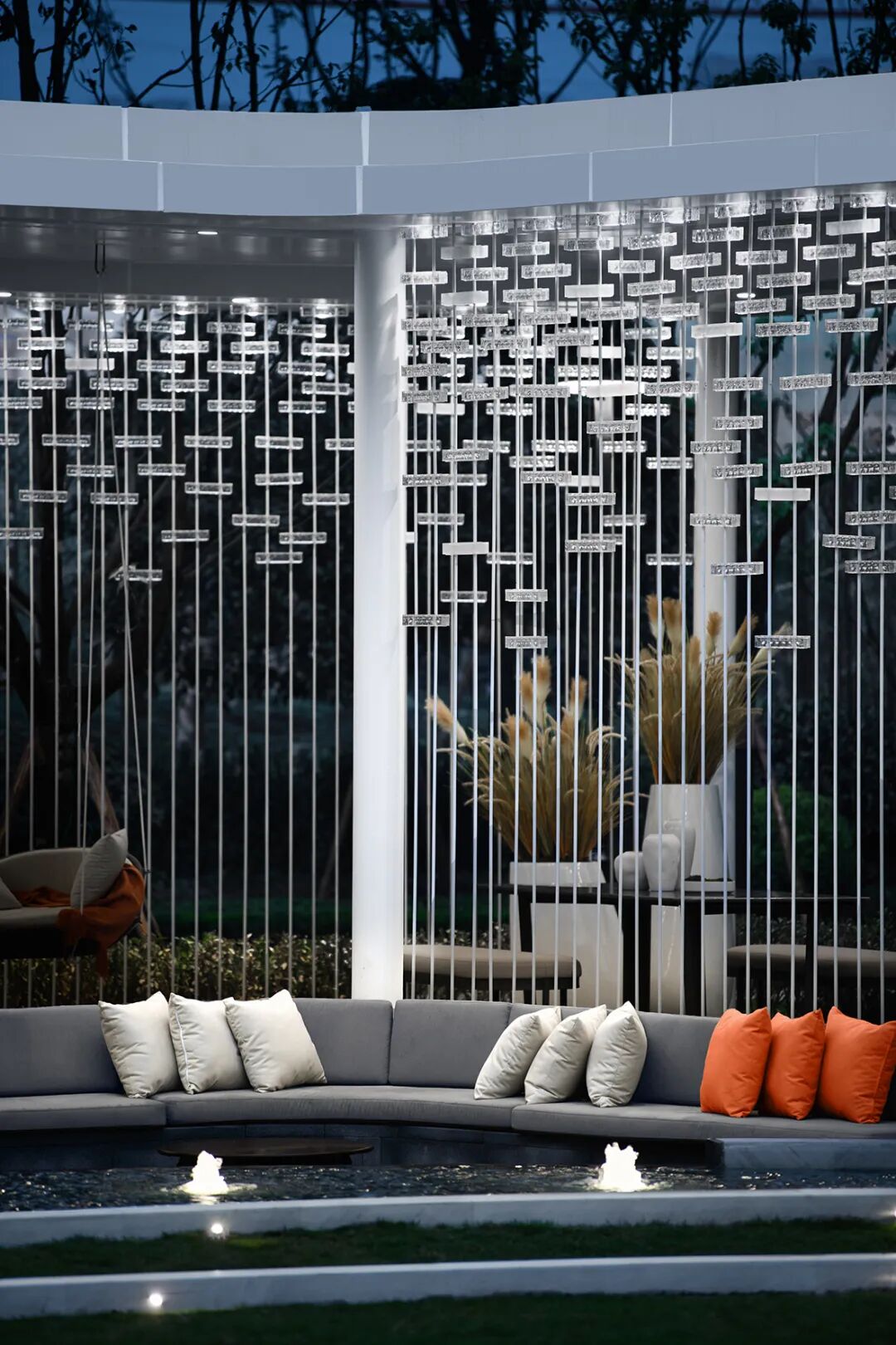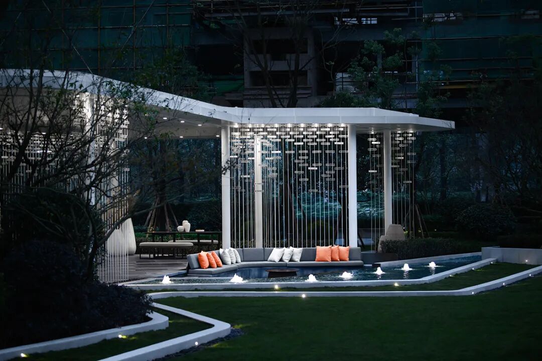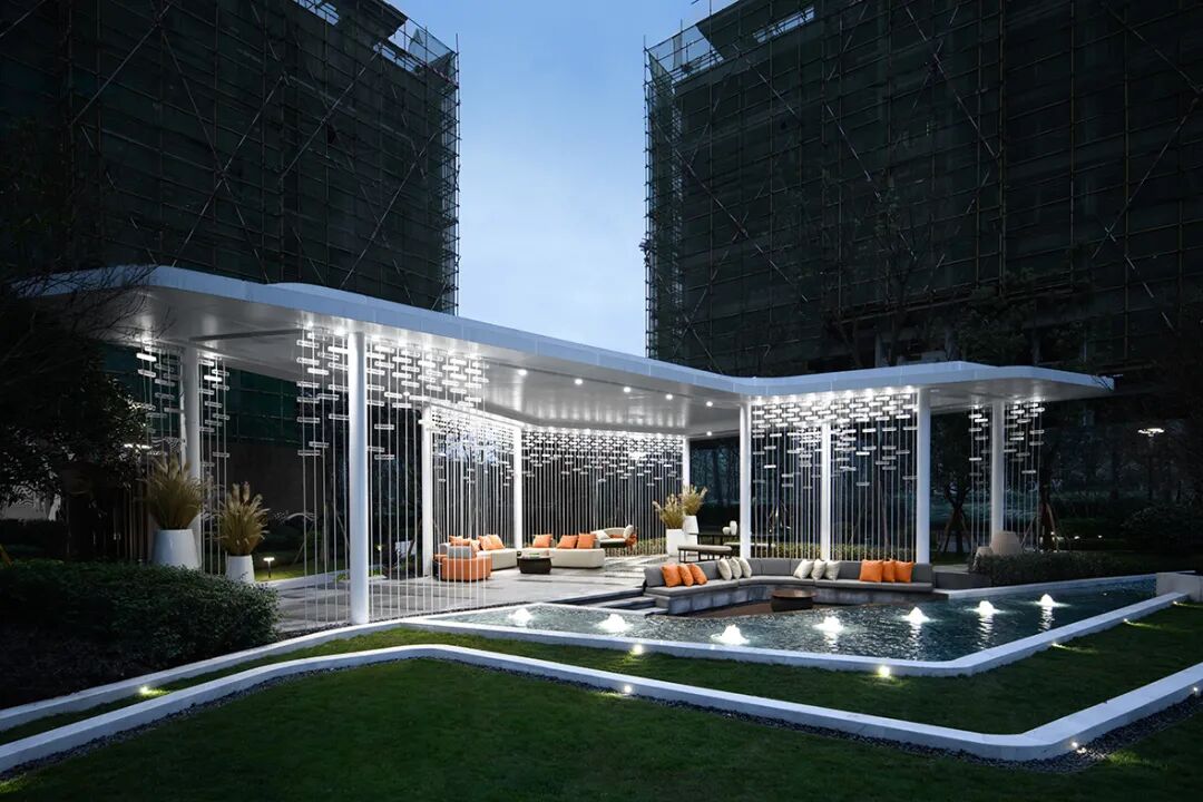 后场空间注重度假式体验感,轻松现代的线型会客廊架增加场地艺术气氛,水景以淡蓝色玻璃石点缀,一旁的度假式躺椅隐于林下,让度假式回家成为一种生活方式。