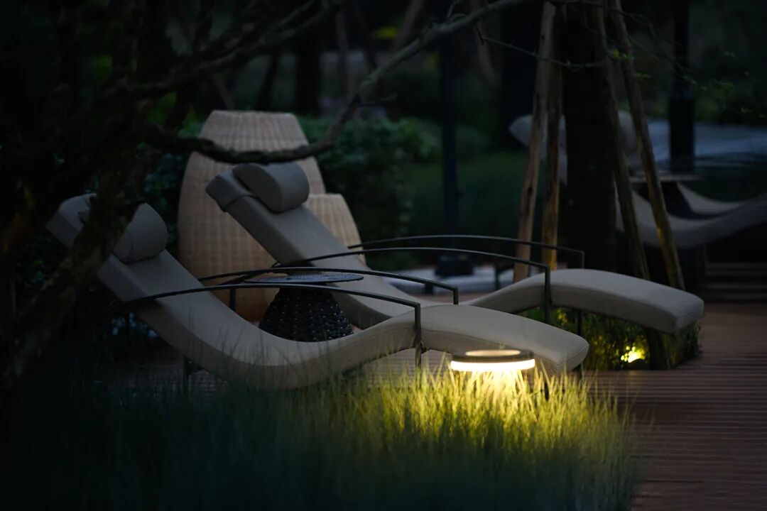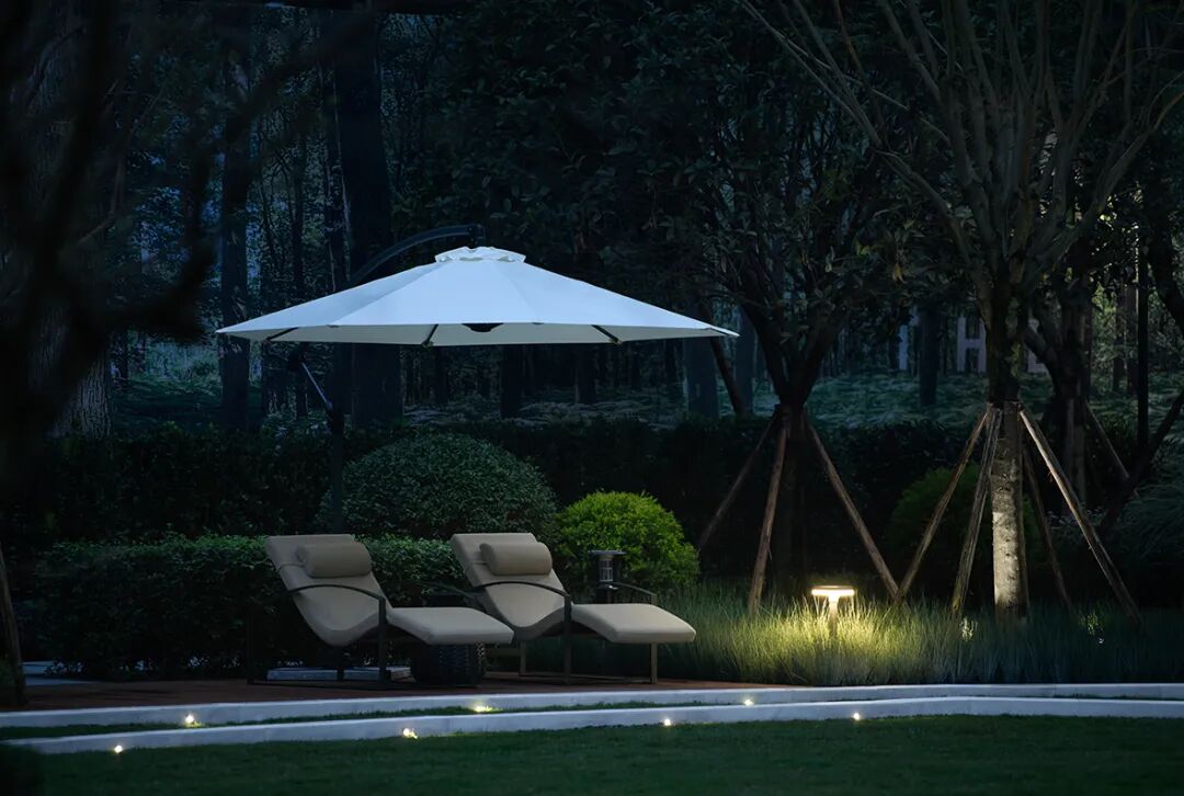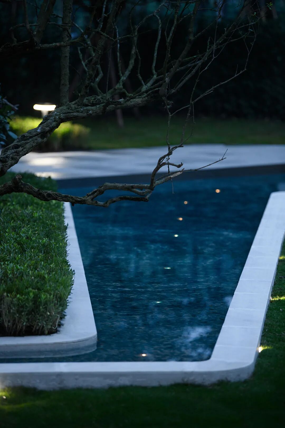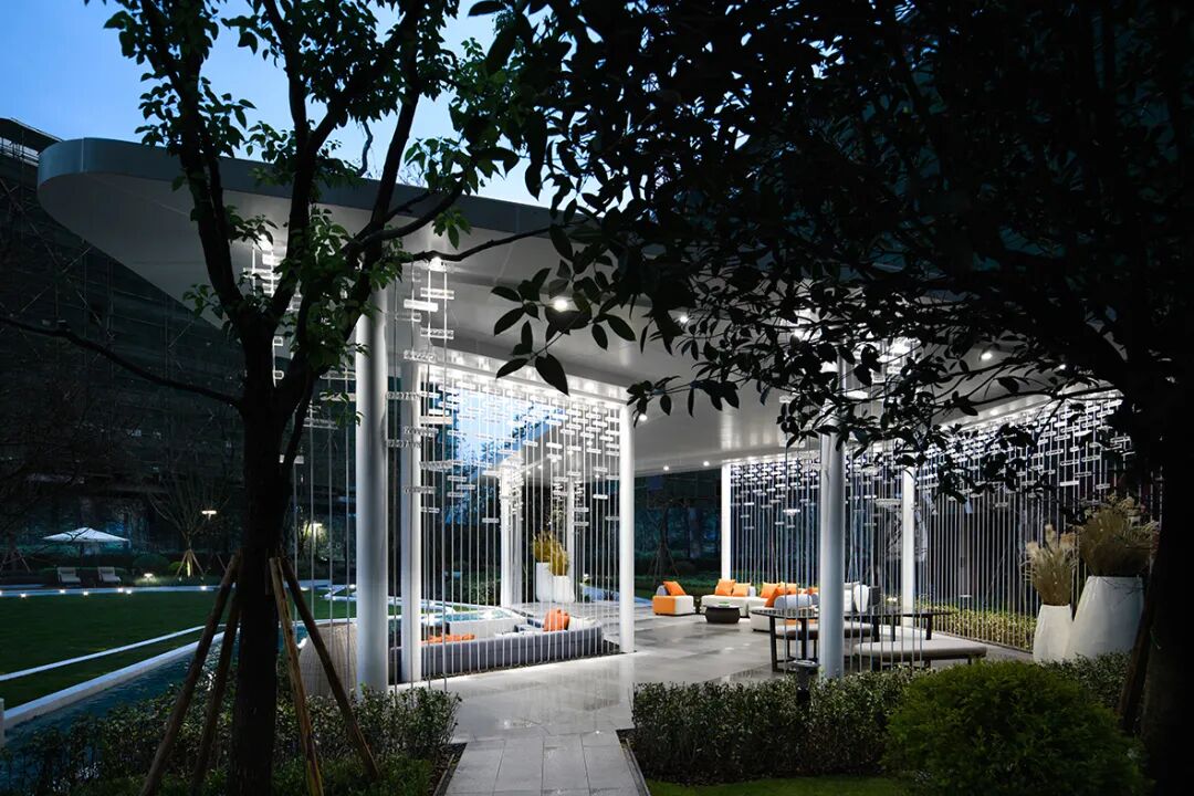 后场空间注重度假式体验感,轻松现代的线型会客廊架增加场地艺术气氛,水景以淡蓝色玻璃石点缀,一旁的度假式躺椅隐于林下,让度假式回家成为一种生活方式。