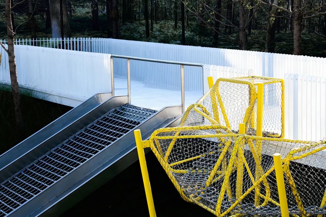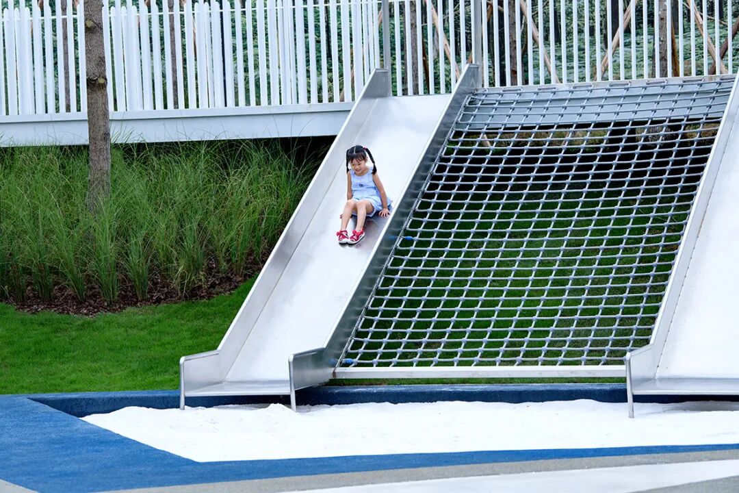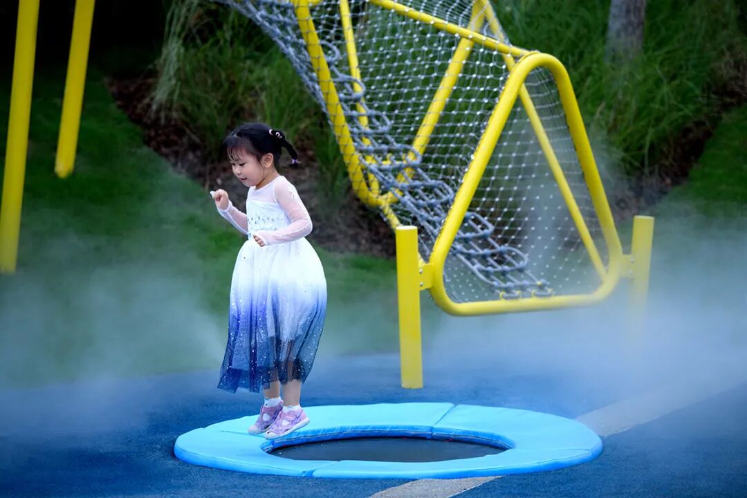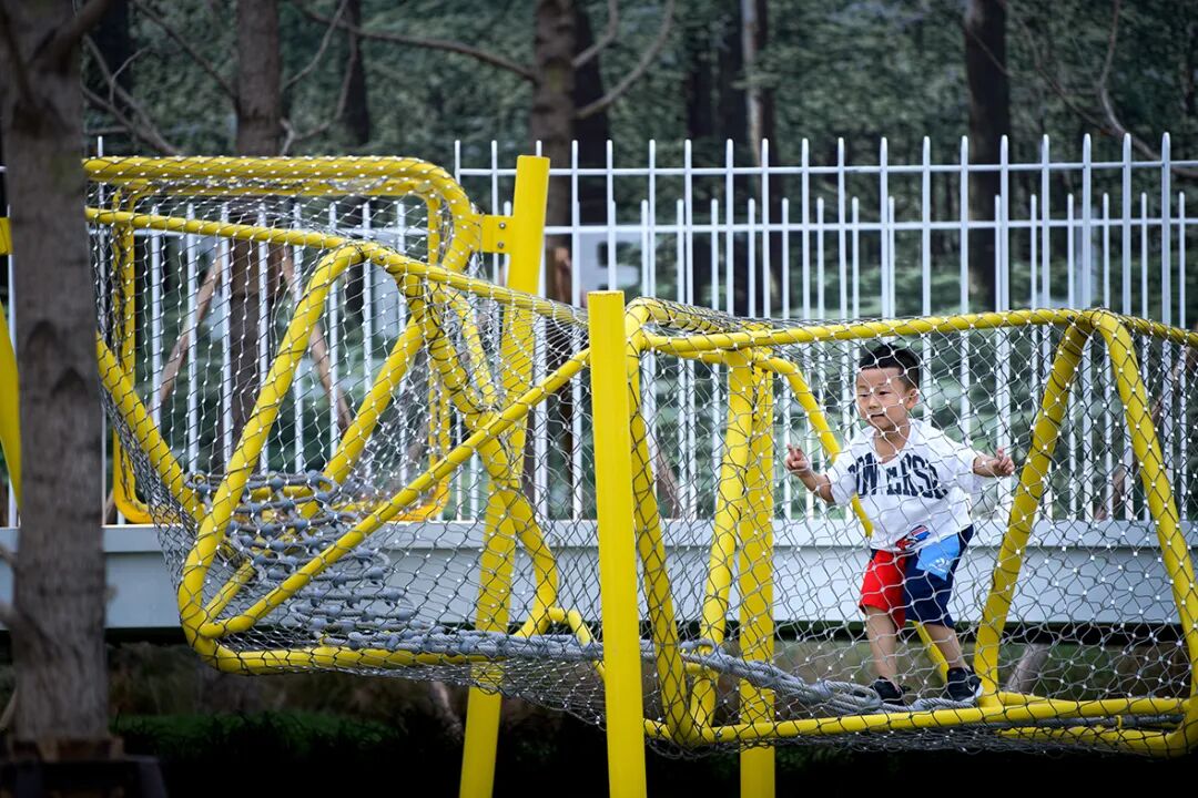 场地中心设计不同玩法,栈桥上的捕梦网是孩子们造梦的宝地,攀爬网结合的组合滑梯可以提升孩子们的平衡能力,互动水景增强场地与人的链接,人们可以在此尽情的享受生活的乐趣。