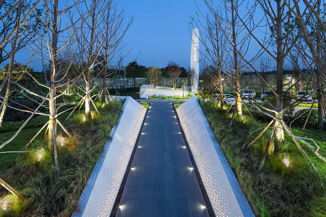 入口景墙运用现代简约的折线处理手法,呼应山城重庆的地势特点,灵动的折线连接起城市界面与场地的关系,加强了景观整体的仪式感。精神堡垒同样演绎简约线条之美,成为归家指引。