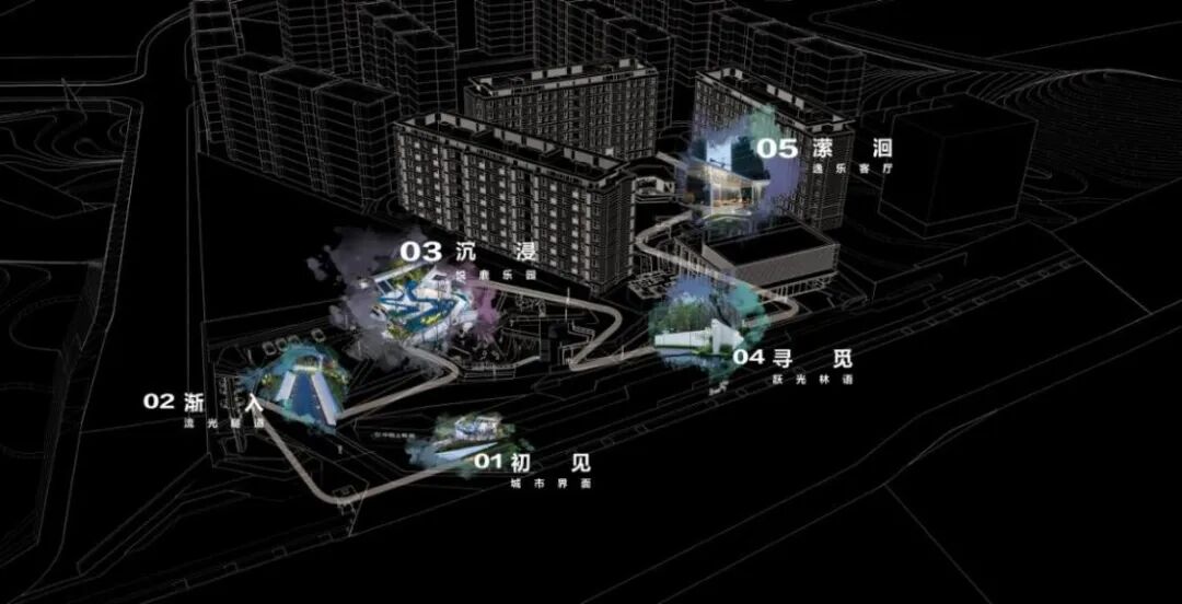 设计摒弃常规空间布局形式,以现代简约线条语言演绎未来大区生活场景,示范区以城市界面、流光隧道、悦鹿乐园、跃光林语、逸乐客厅五个主题节点串联。