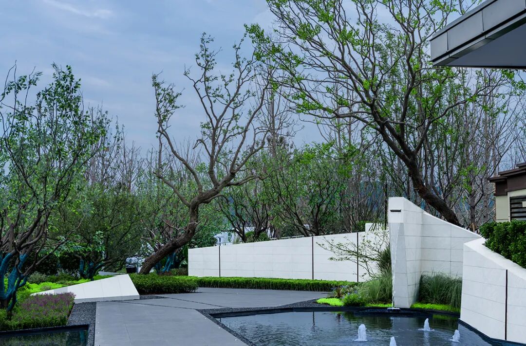 折线景墙营造高低起伏的线条变化,为人们指引归家的道路,道路两侧搭配静态水景作为衬托,营造宁静悠远的氛围。