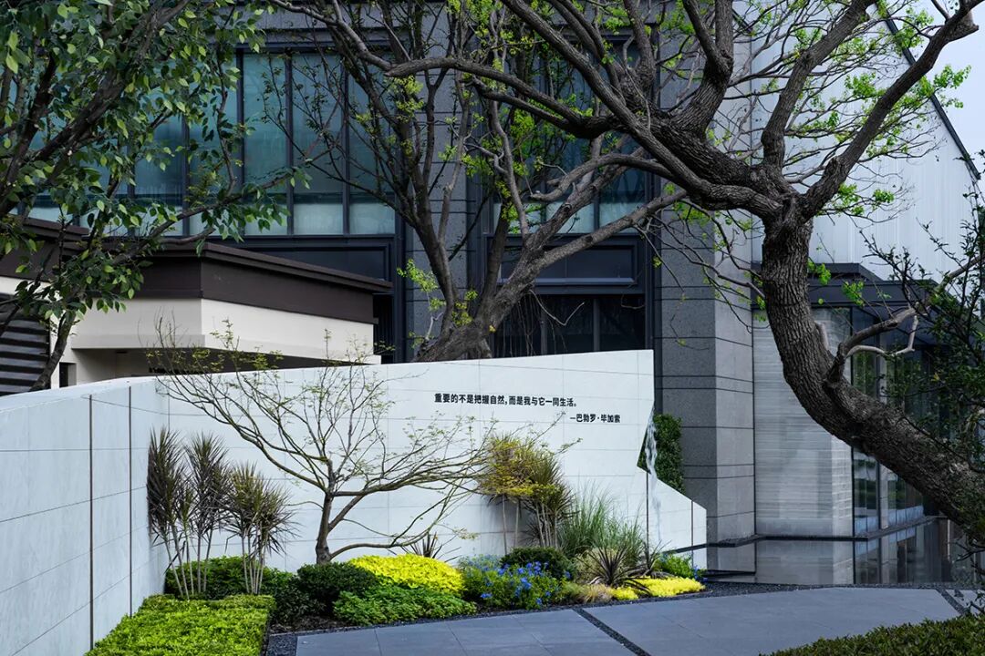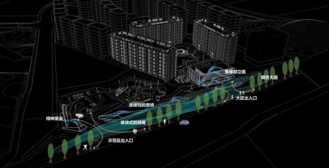 通过精神堡垒、连续性的景墙、体块式的绿篱以及售楼部立面加强整个市政界面的昭示性,信步穿过示范区入口,仿佛踏上了探寻自然与乐趣的旅程,城市的喧嚣与浮躁都被隔绝在外。
