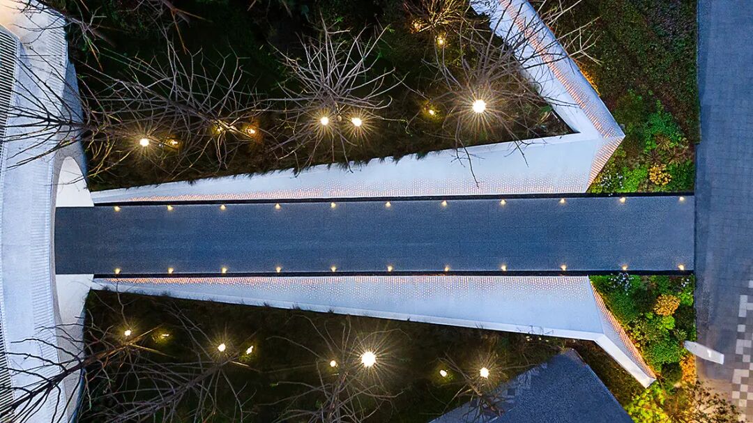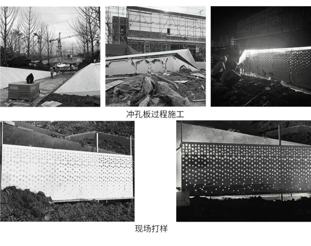 下沉通道两侧的冲孔板渐变图案来源于鹿脚印,模拟鹿在深林中行走的感受,打造沉浸式体验。冲孔图案设计给施工增加了巨大难度,设计团队针对图案、及排布方式数次推演调整、充分考虑工艺工法,精益求精,并根据现场不断进行各项调整得以完成最终制作。