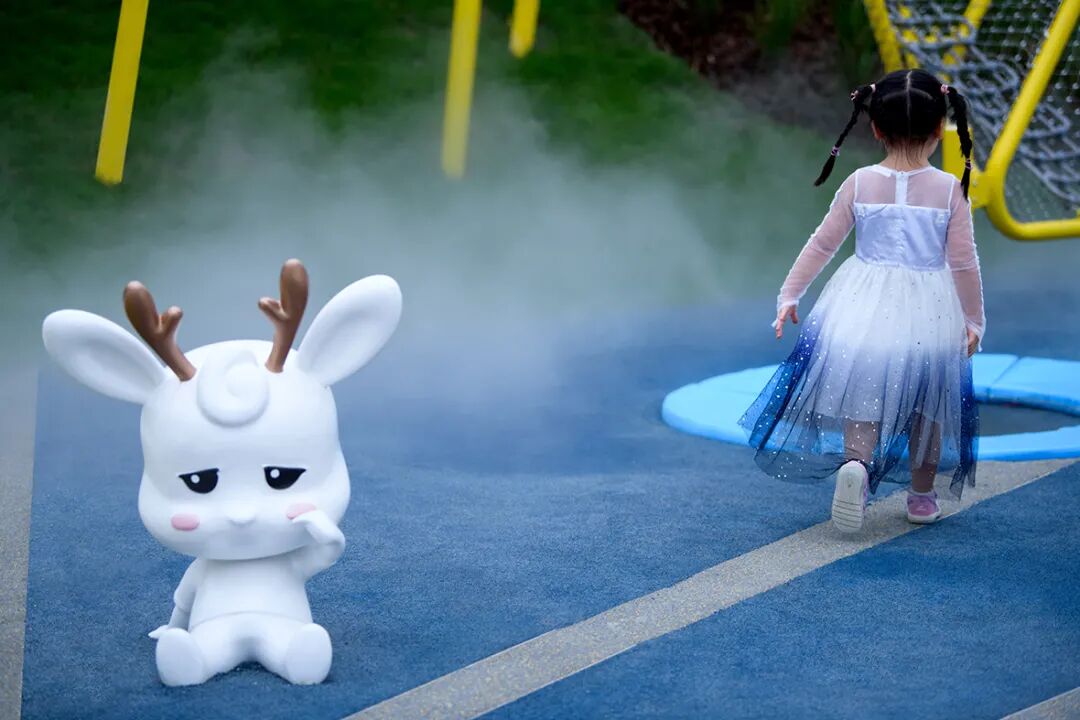 由中南品牌IP灵感演变而来的小鹿造型各异,吹泡泡、荡秋千等,不同造型也对应了不同的玩法,增强了场地趣味性。