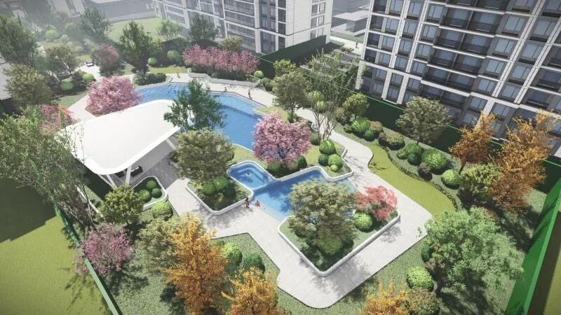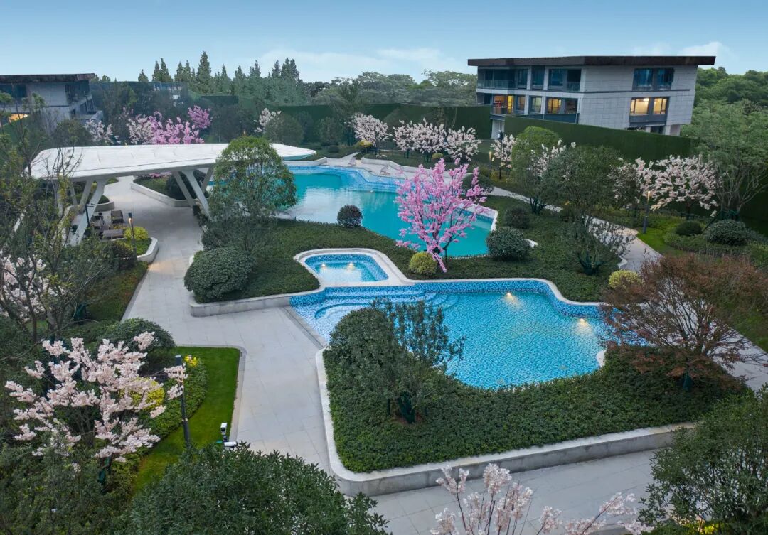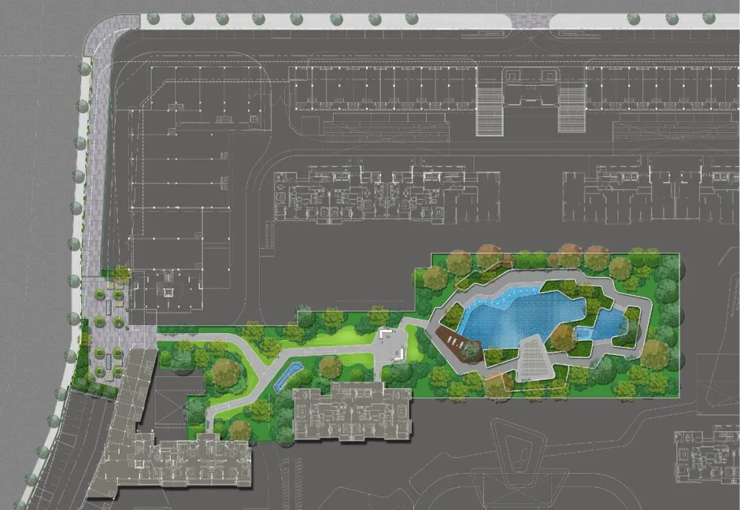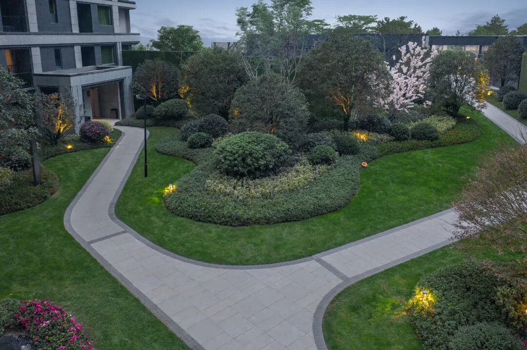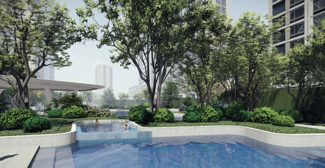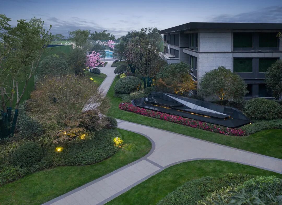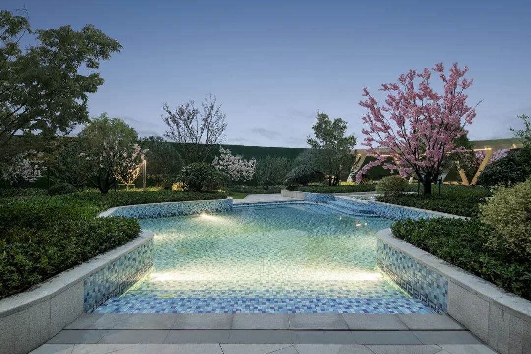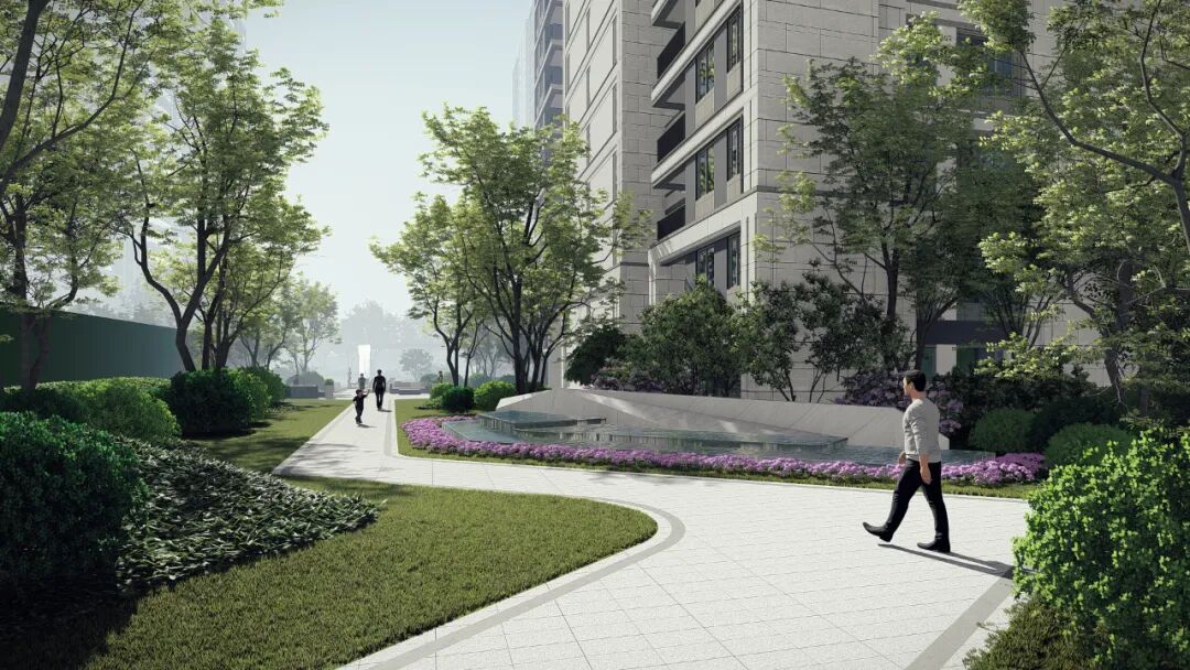 沿着步道走过样板房区域,便是直观的未来大区居住环境体验。转角处的几何形特色叠水水景让人眼前一亮,有如山间的小瀑布,从高处一层一层地奔下山来。树木扶疏,花香阵阵,便是山间生活的情趣所在。形似流水的步道在此急转,短暂停留之后,继续向前奔去,预示着更多惊喜。