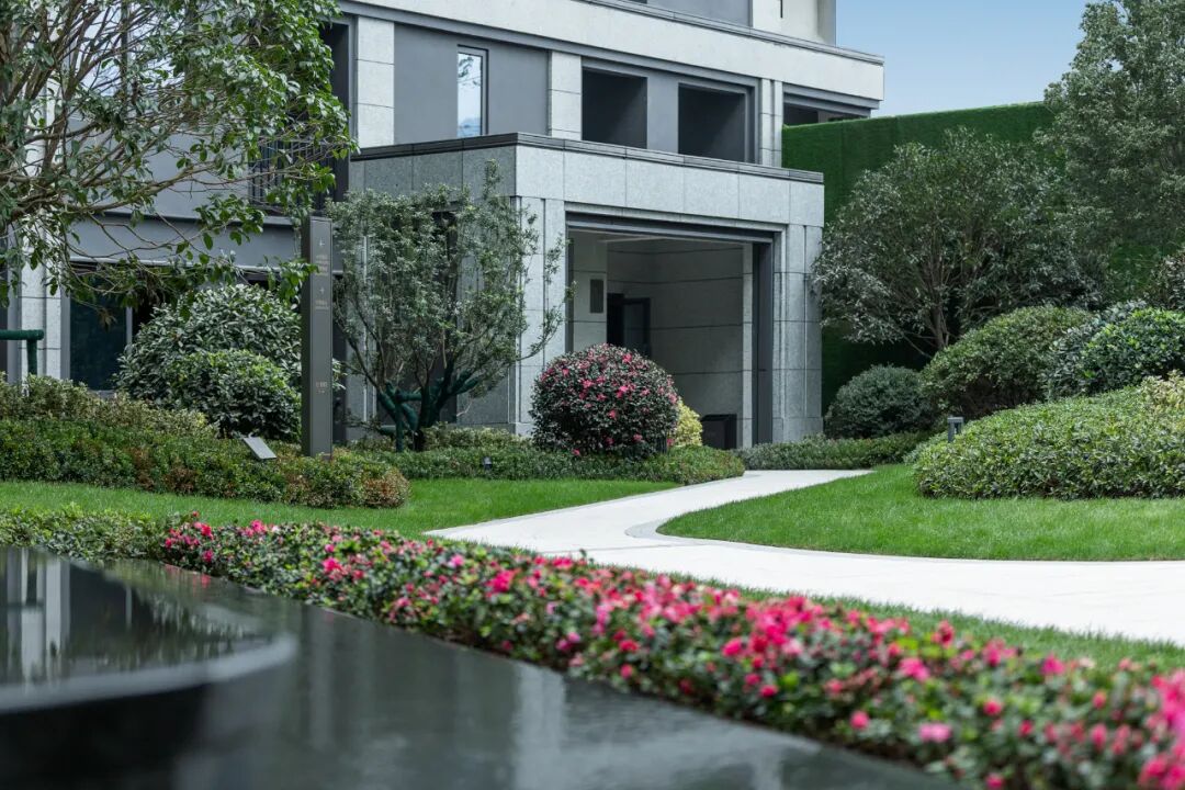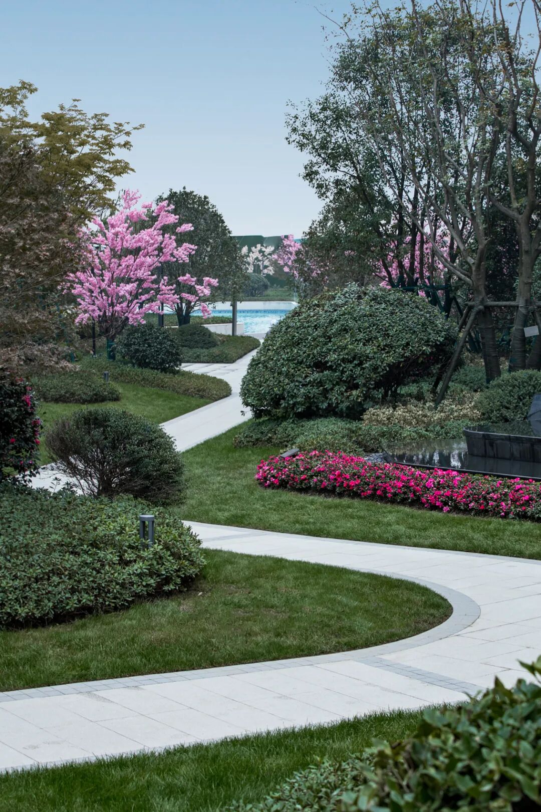 通往样板房和示范区中景的路径模拟出河流的形态,道路两旁配以特色水景、绿岛、草坪、雕塑,以及各色植物,在怡人的风景中渐入佳境。步道状似动态的流水,两旁植物互相映衬,树影婆娑,行走其间一步一景,生动有趣,让人不禁就这样带着期盼的心情进入样板房区域。