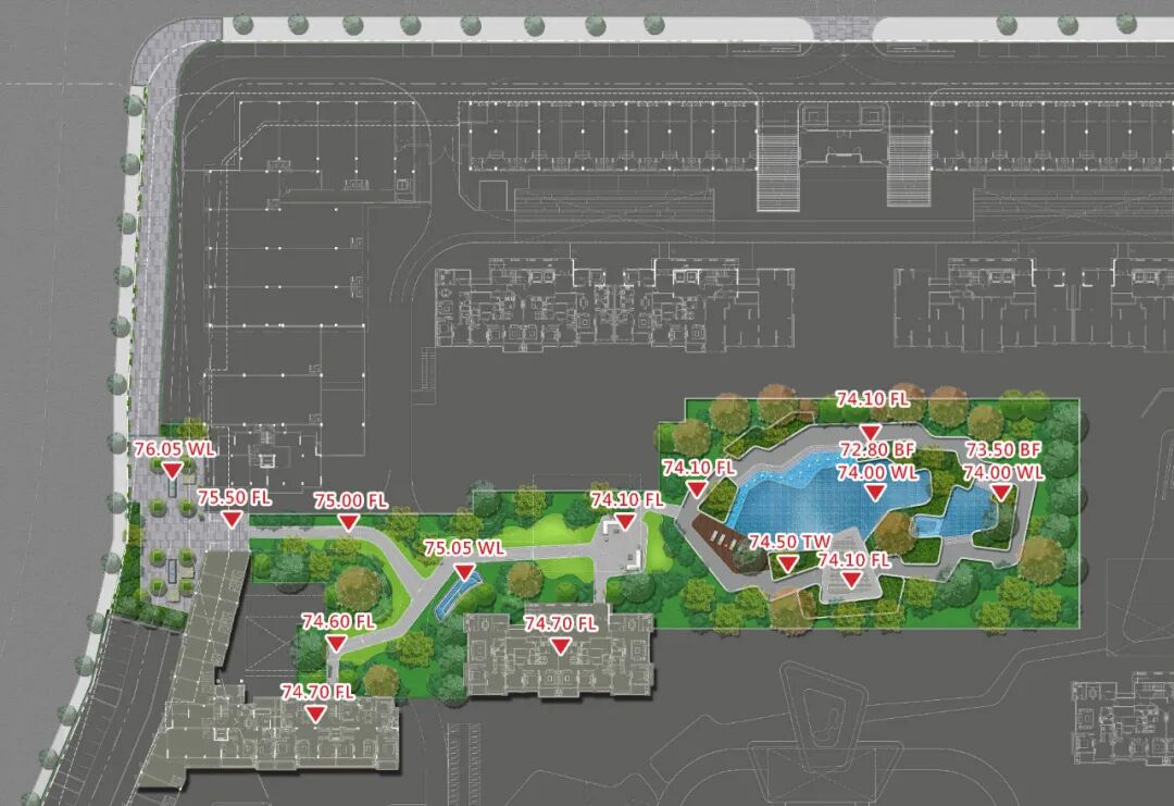 *示范区标高图。基地自带较大高差,蜿蜒的步道在连接绿岛、草坪、特色水景的同时,也将高差化于无形。