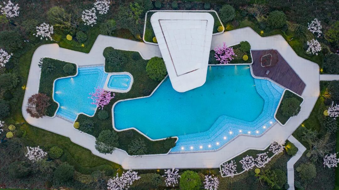 位于参观动线终点的按摩池又是一个点睛之笔,在花坛的围合中像极了被山林环抱的最后的秘境。天空、植物、建筑倒映在清澈的水面上,让天与地融为了一体。至此,悠闲、绿色、宜居的未来美好生活景象表露无遗。