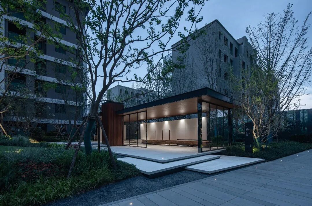 四十五米超长横向展开的大门,平静奢华的气息扑面而来。落客区、涌泉水景、黑玻景墙、超长挑檐,层层递进的景观视野,凸显细节与体量感,打破空间的界限。