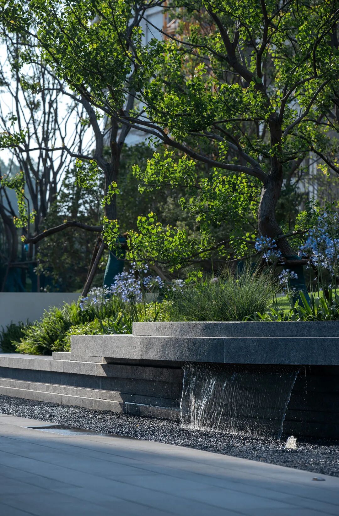 中庭空间长廊倚于一侧,既屏蔽西侧车行道的干扰,给水景留出完整的空间,局部设置休憩空间,为空间增添了有序的变化,功能性与艺术性兼具。