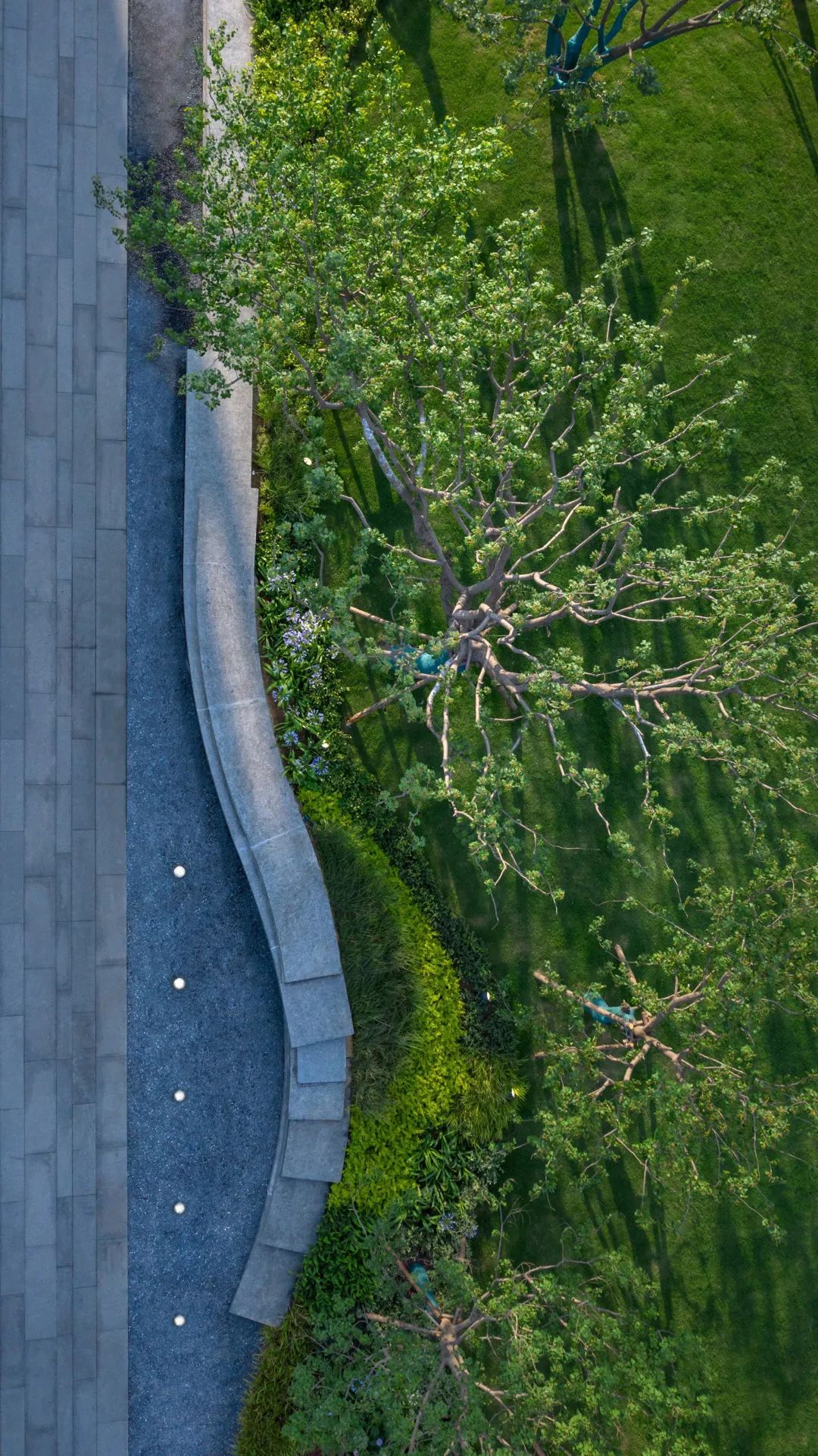 后场采用生态草坡林地,柔化边界。节点增加跌水、景亭休憩空间,展现生活氛围,营造未来生活场景。