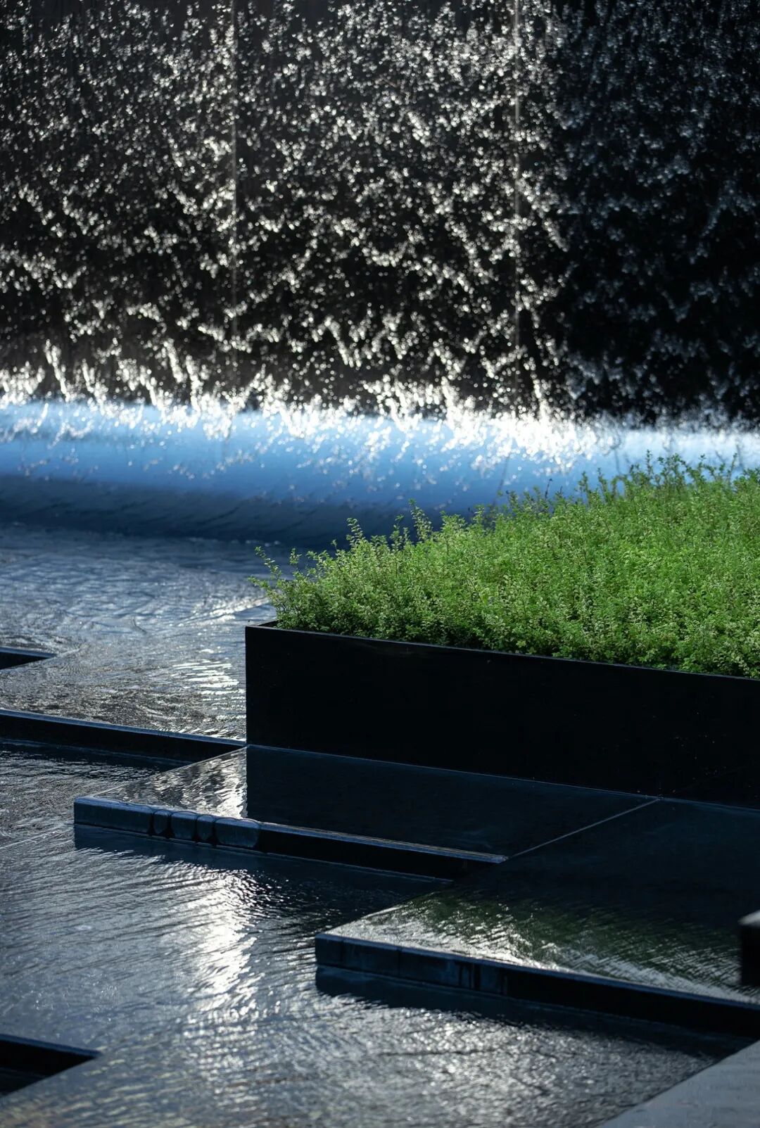 镜面水幕作为与其它维度的连接方式,起到双倍空间的视觉效果,达到“水幕墙”与“透视墙”的优雅融合,小中见大。