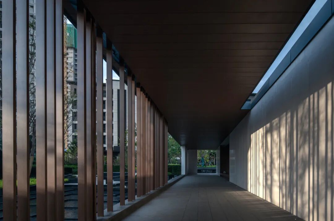 光影与树影交汇,透过格栅投射在长廊上,其丰富性变得可见且有形。