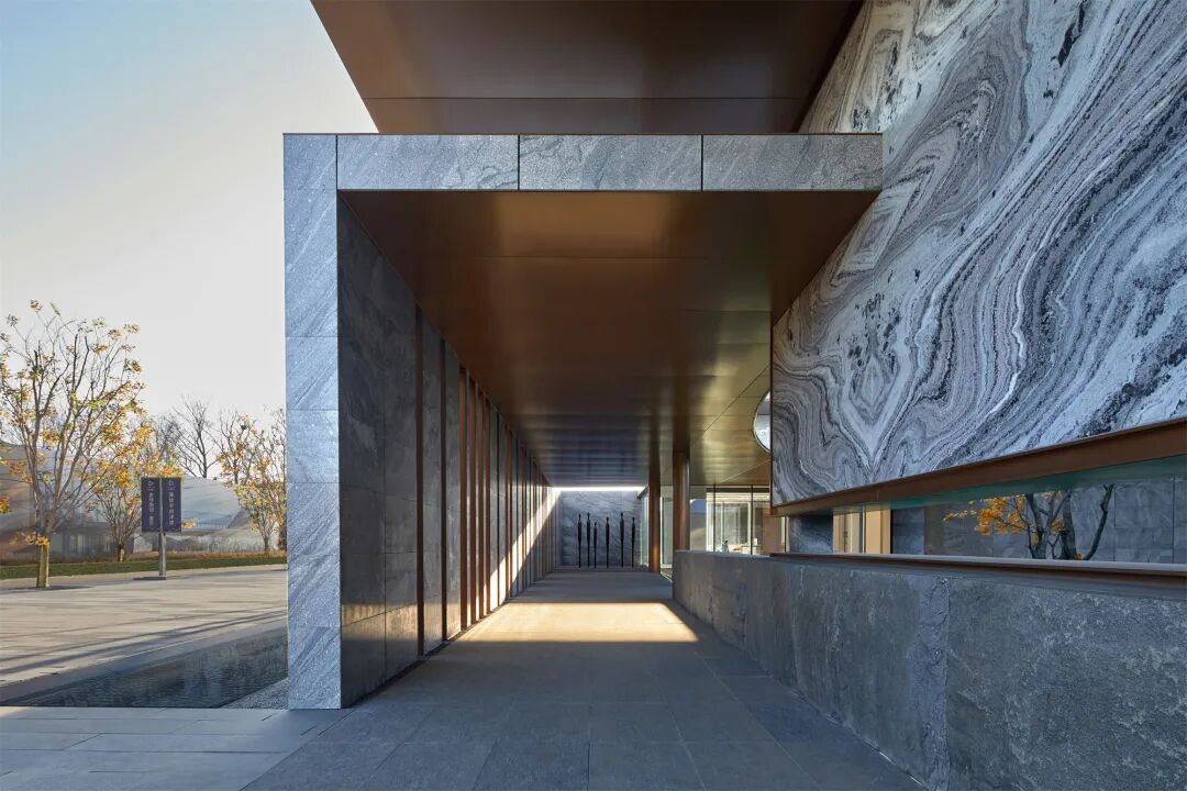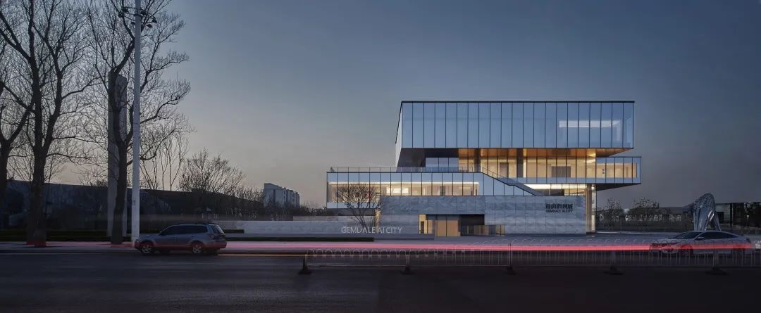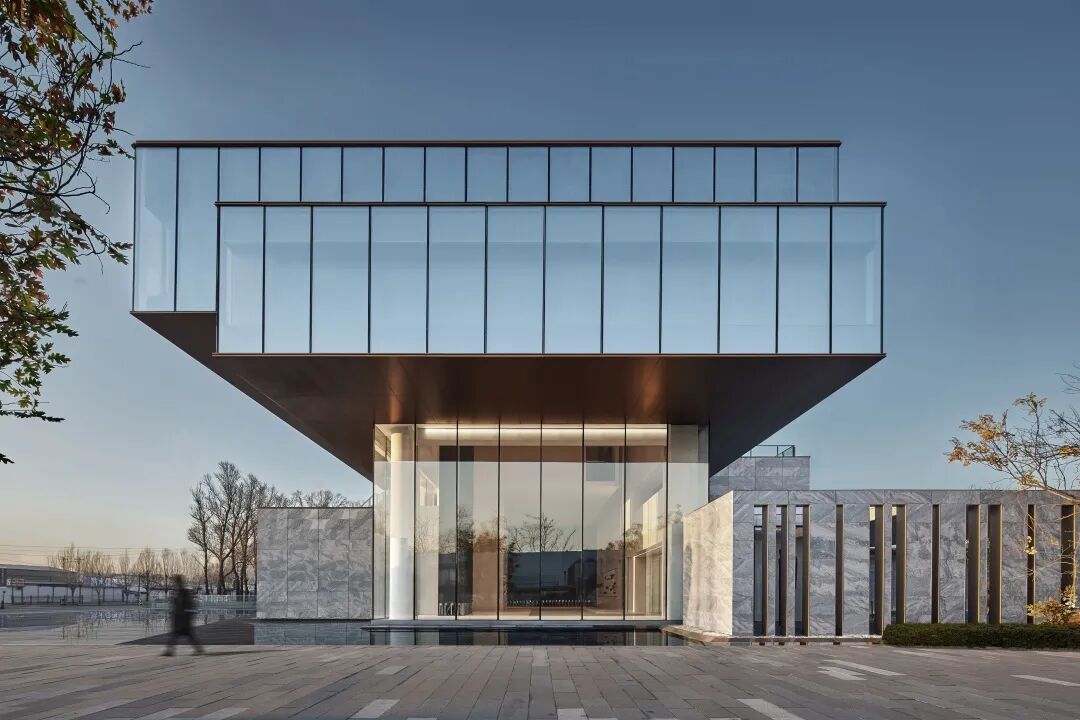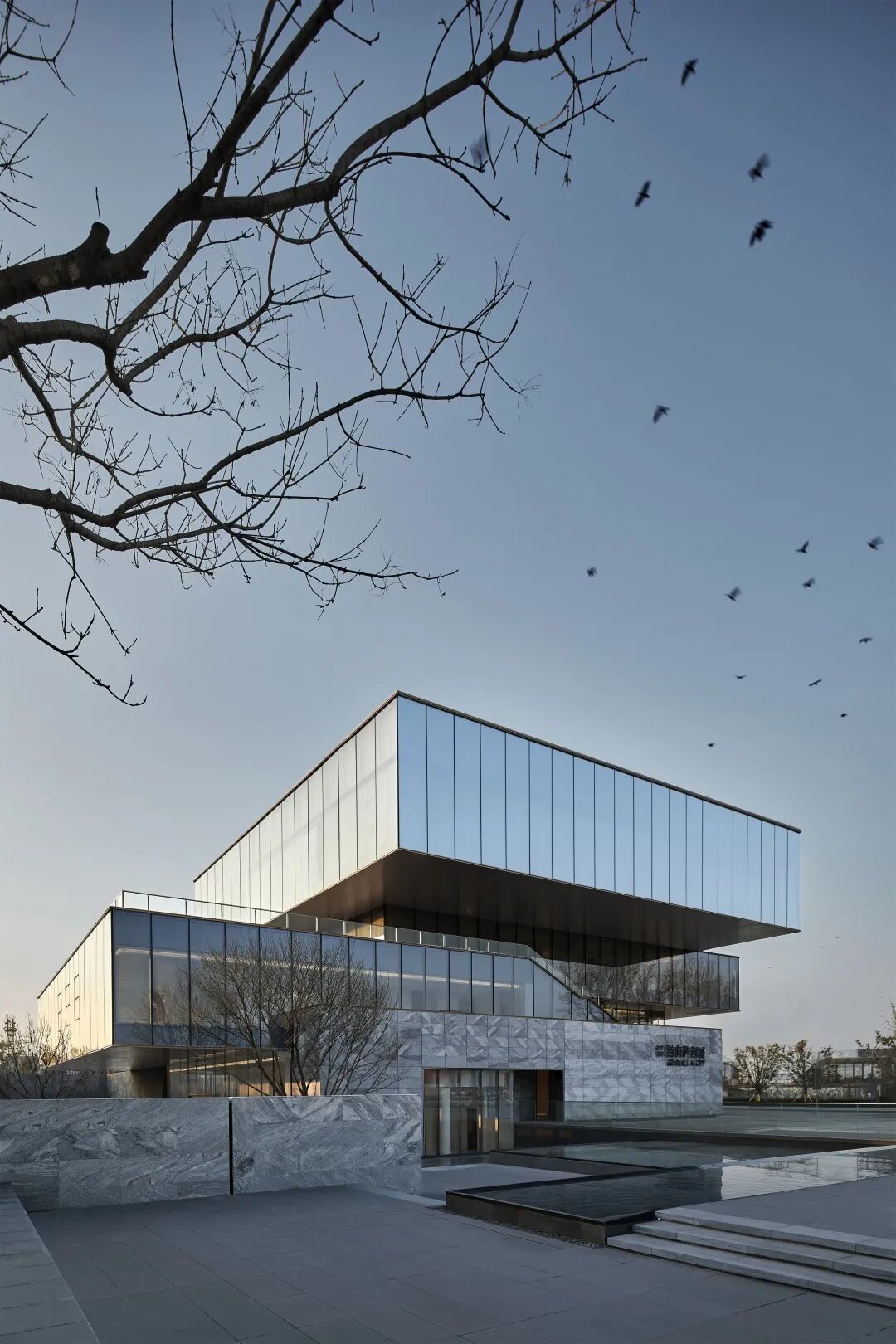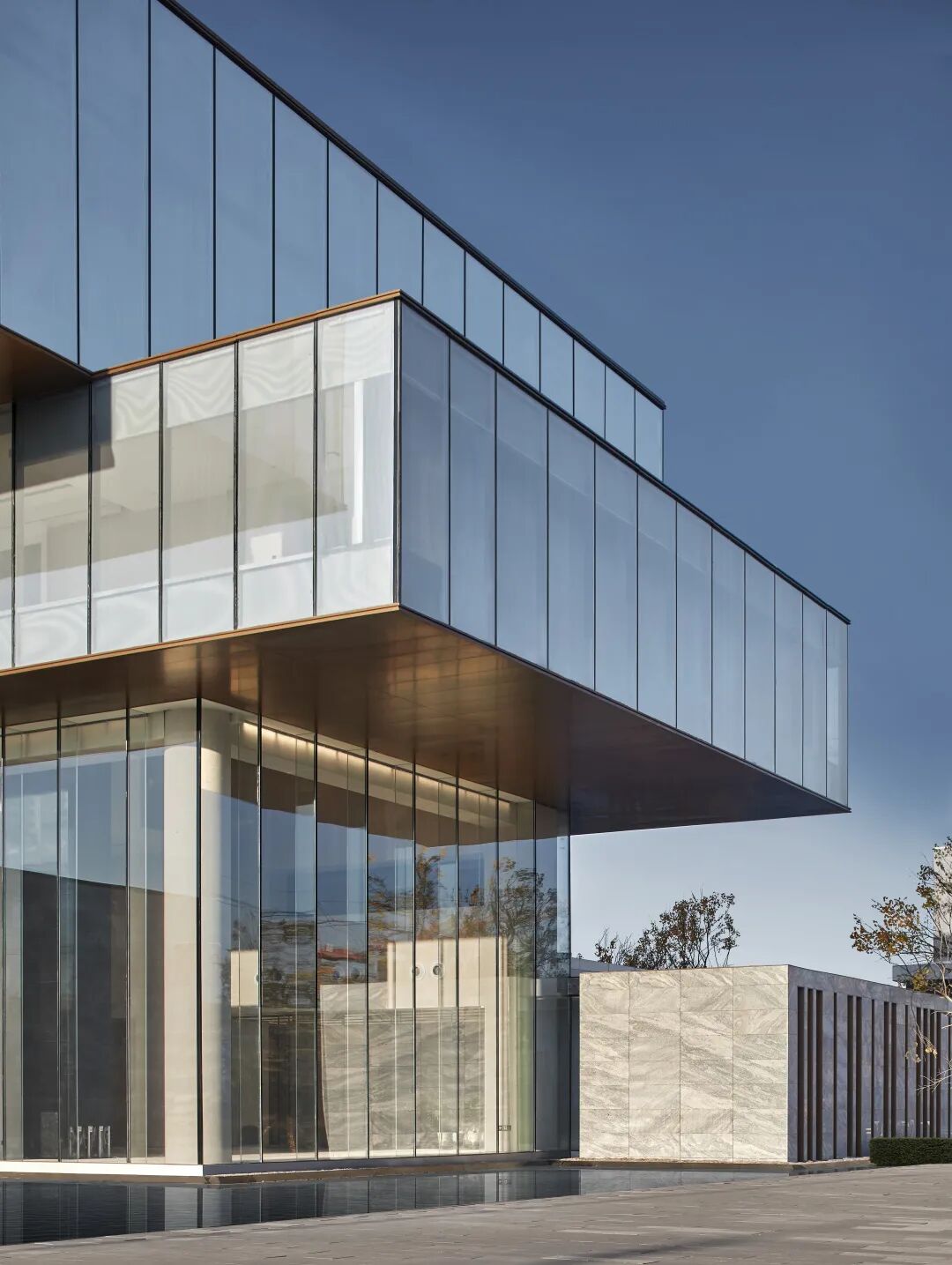 为了减轻体量带来的压迫感,在材质的使用上,我们选择了新西兰灰麻石材、高透白玻璃和彩釉玻璃的搭配组合,大色块灰与白的碰撞,简洁又不失张力,以场地为中心向周边散发出优雅的魅力。