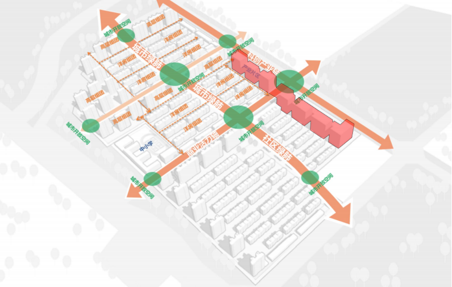 延续产城融合的发展内核,我们从规划设计出发努力打造适合在地属性的空间,用分解的手法,打碎、叠加、重组空间功能,创造出多节点空间,并在看似不确定的空间内,置入多个节点又将空间重新串联,商业与城市空间在功能上实现了相互流动,相辅相成。
